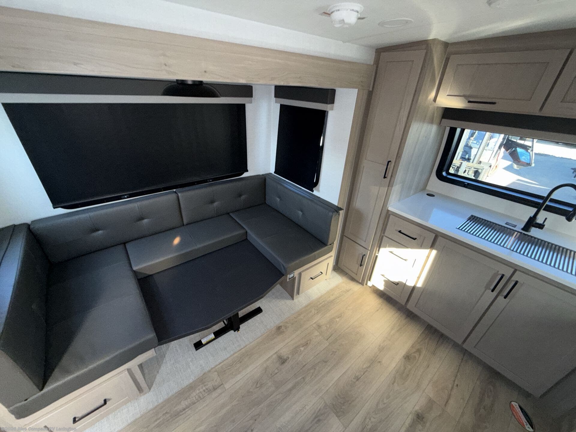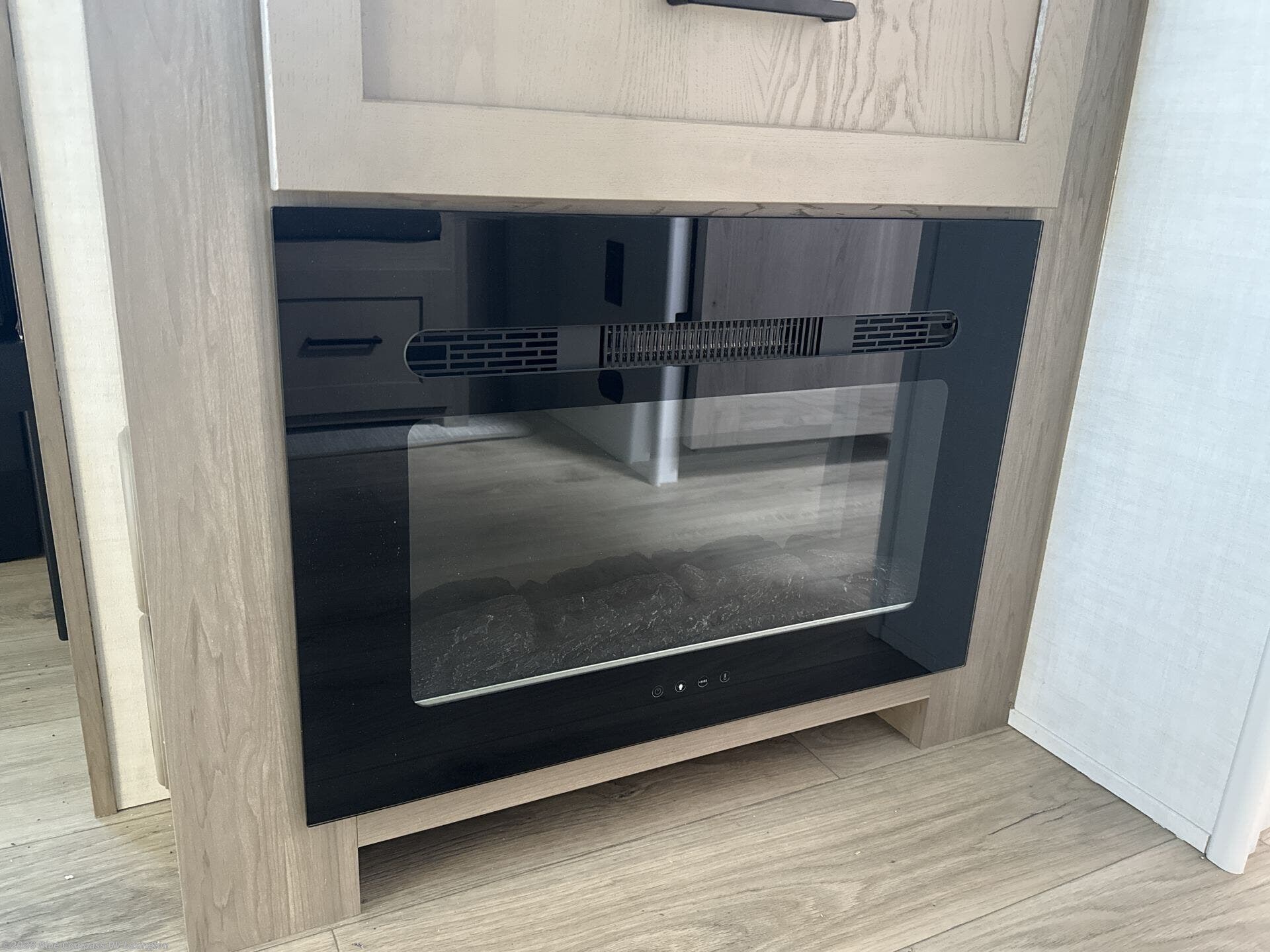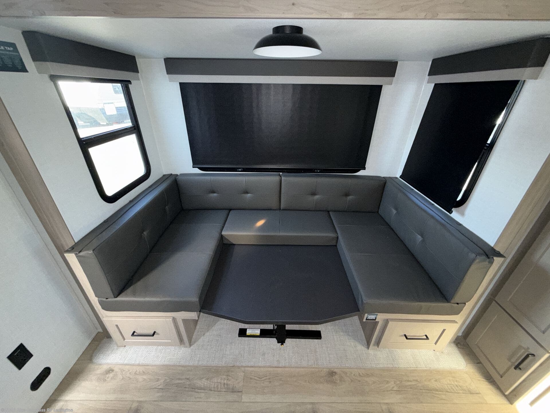 With dual entry doors and a front kitchen with generous counter space, this trailer is perfect for weekends at the campground! A U-shaped dinette slides provides more floor space inside, and it's in great view of the TV and fireplace. You'll find that the walk-thru bath is easily accessible, and the rear master bedroom will feel just like home with its RV queen bed and flip-up storage!