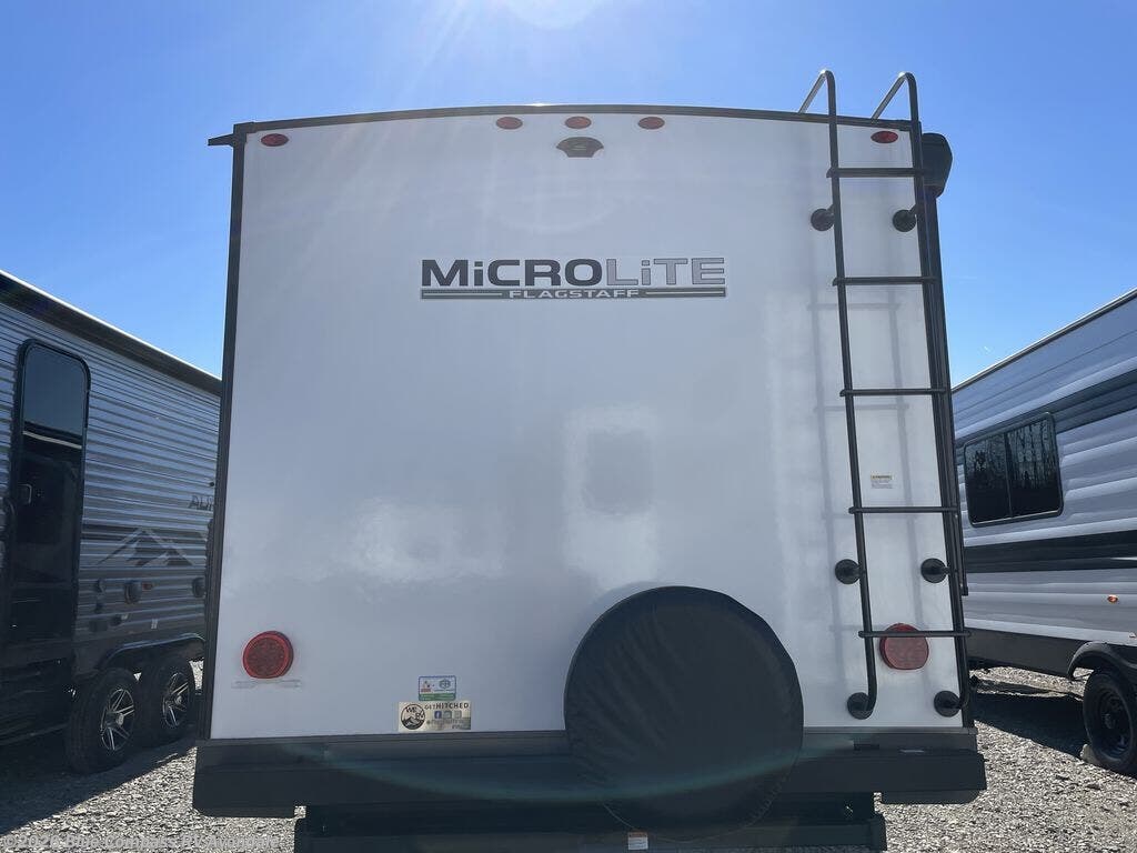 With any Flagstaff Micro Lite travel trailer by Forest River you will enjoy lightweight towing, durable construction, and added interior comforts to make each trip memorable! Each model features RoadTech tire pressure monitoring, Dexter Torflex axles, and nitrogen-filled Goodyear endurance tires for smooth towing from home to campground. The 6-sided aluminum framed construction provides a strong foundation so you can enjoy your RV for years to come, plus the radiant foil in the front cap, underbelly and slides help insulate your trailer. Additional exterior features include a 200W solar panel, back-up camera prep, frameless windows, and slam baggage doors. Each model includes the Great Expectations Package with roller shades, solid surface kitchen countertops, and hidden hinge cabinet doors. There is also an exterior hot/cold water port, outside speakers, a power tongue jack and stabilizer jacks, plus many more conveniences.