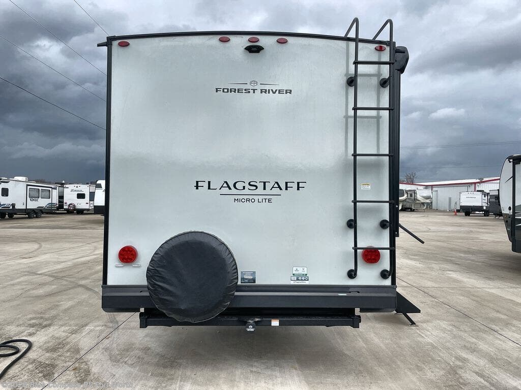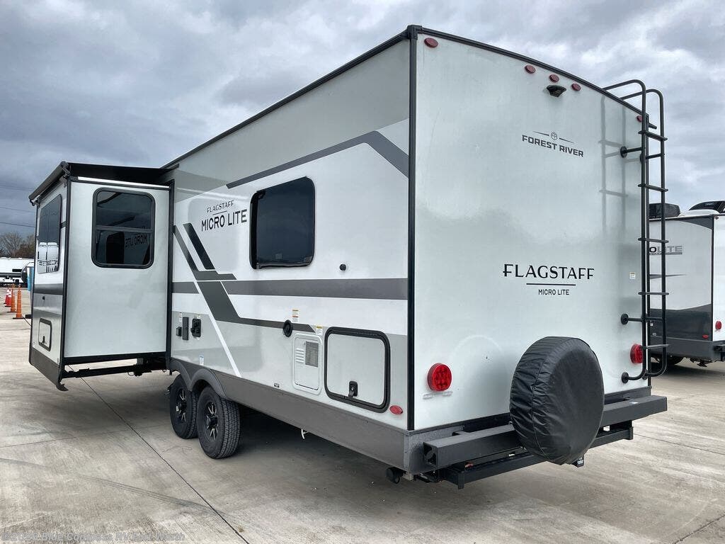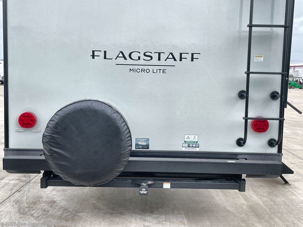 With any Flagstaff Micro Lite travel trailer by Forest River you will enjoy lightweight towing, durable construction, and added interior comforts to make each trip memorable! Each model features RoadTech tire pressure monitoring, Dexter Torflex axles, and nitrogen-filled Goodyear endurance tires for smooth towing from home to campground. The 6-sided aluminum framed construction provides a strong foundation so you can enjoy your RV for years to come, plus the radiant foil in the front cap, underbelly and slides help insulate your trailer. Additional exterior features include a 200W solar panel, back-up camera prep, frameless windows, and slam baggage doors. Each model includes the Great Expectations Package with roller shades, solid surface kitchen countertops, and hidden hinge cabinet doors. There is also an exterior hot/cold water port, outside speakers, a power tongue jack and stabilizer jacks, plus many more conveniences.