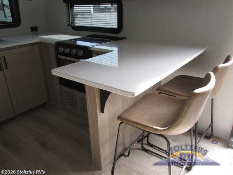 This front kitchen travel trailer is sure to make all your camping wishes come true. It's perfect for a couple since there is a master bedroom with a 60" x 80" queen bed, plus a theater seat in the main living area. If you're needing additional sleeping spaces, just choose the optional hide-a-bed sofa in place of the theater seat. The generous counter space in the kitchen will give you plenty of space to prep meals, and there is a bartop with stools where you can dine together. Along with the queen bed slide, the bedroom also includes a dresser, a TV option, plus a wardrobe with washer and dryer prep if you choose to add these appliances. And don't overlook the full rear bath to freshen up each day!
