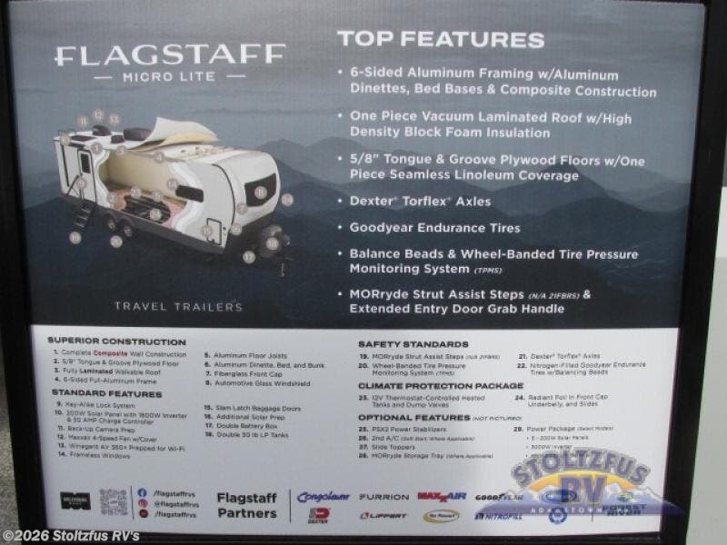With any Flagstaff Micro Lite travel trailer by Forest River you will enjoy lightweight towing, durable construction, and added interior comforts to make each trip memorable! Each model features RoadTech tire pressure monitoring, Dexter Torflex axles, and nitrogen-filled Goodyear endurance tires for smooth towing from home to campground. The 6-sided aluminum framed construction provides a strong foundation so you can enjoy your RV for years to come, plus the radiant foil in the front cap, underbelly and slides help insulate your trailer. Additional exterior features include a 200W solar panel, back-up camera prep, frameless windows, and slam baggage doors. Each model includes the Great Expectations Package with roller shades, solid surface kitchen countertops, and hidden hinge cabinet doors. There is also an exterior hot/cold water port, outside speakers, a power tongue jack and stabilizer jacks, plus many more conveniences.