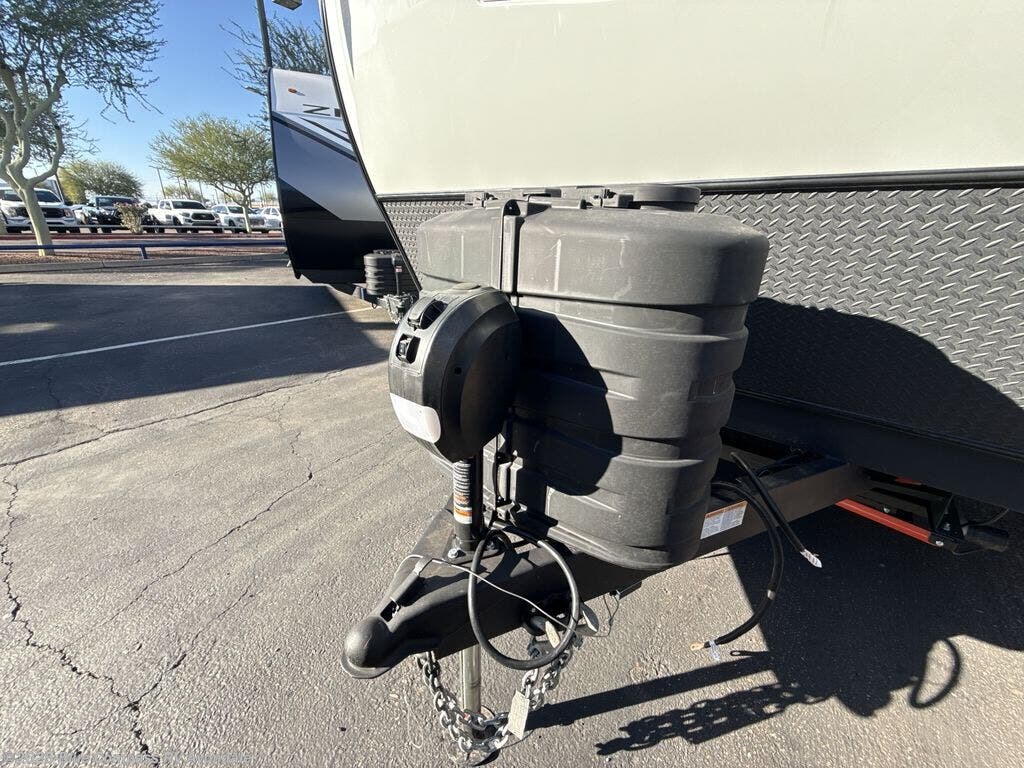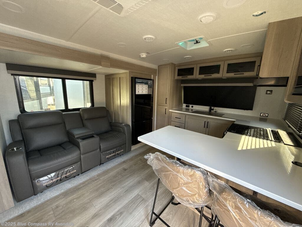 This front kitchen travel trailer is sure to make all your camping wishes come true. It's perfect for a couple since there is a master bedroom with a 60" x 80" queen bed, plus a theater seat in the main living area. If you're needing additional sleeping spaces, just choose the optional hide-a-bed sofa in place of the theater seat. The generous counter space in the kitchen will give you plenty of space to prep meals, and there is a bartop with stools where you can dine together. Along with the queen bed slide, the bedroom also includes a dresser, a TV option, plus a wardrobe with washer and dryer prep if you choose to add these appliances. And don't overlook the full rear bath to freshen up each day!