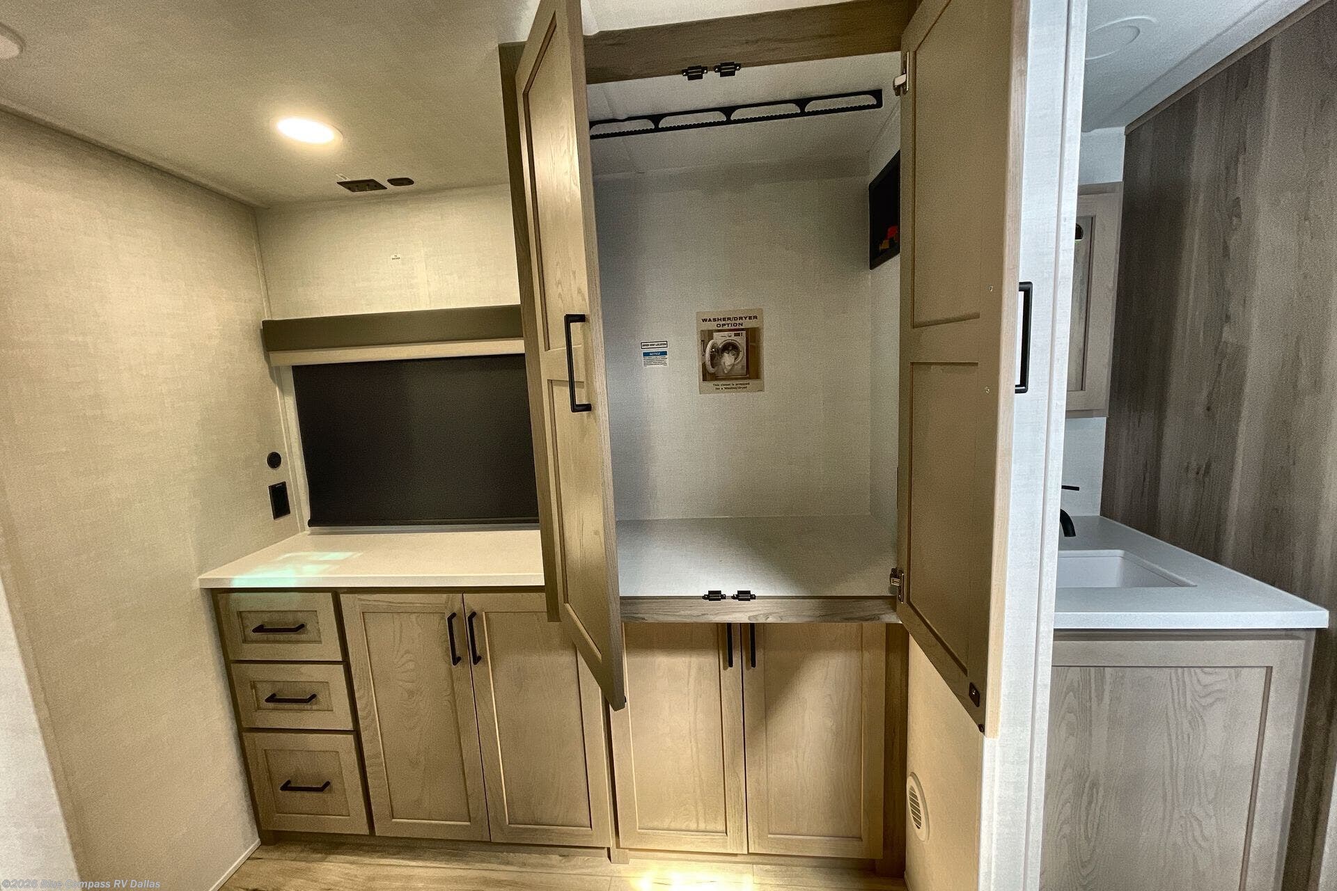This front kitchen travel trailer is sure to make all your camping wishes come true. It's perfect for a couple since there is a master bedroom with a 60" x 80" queen bed, plus a theater seat in the main living area. If you're needing additional sleeping spaces, just choose the optional hide-a-bed sofa in place of the theater seat. The generous counter space in the kitchen will give you plenty of space to prep meals, and there is a bartop with stools where you can dine together. Along with the queen bed slide, the bedroom also includes a dresser, a TV option, plus a wardrobe with washer and dryer prep if you choose to add these appliances. And don't overlook the full rear bath to freshen up each day!