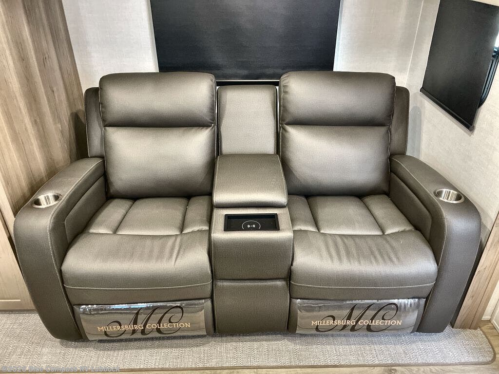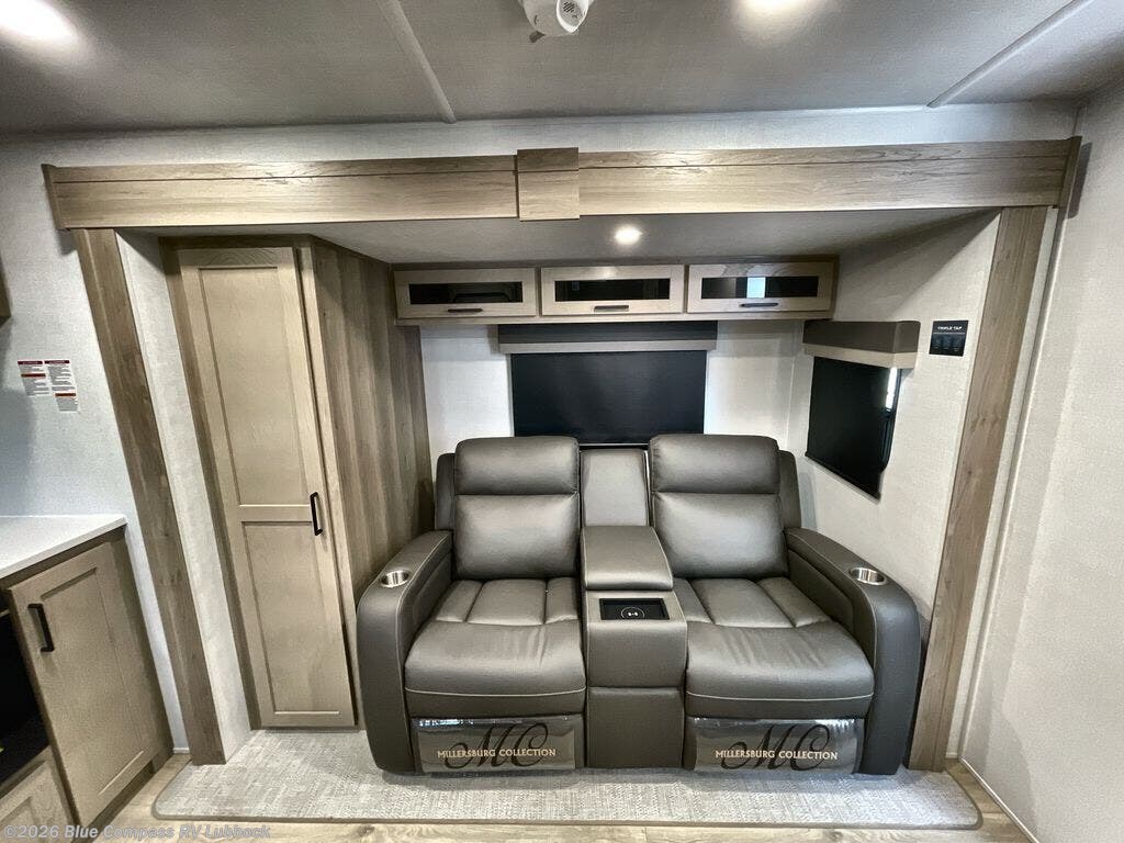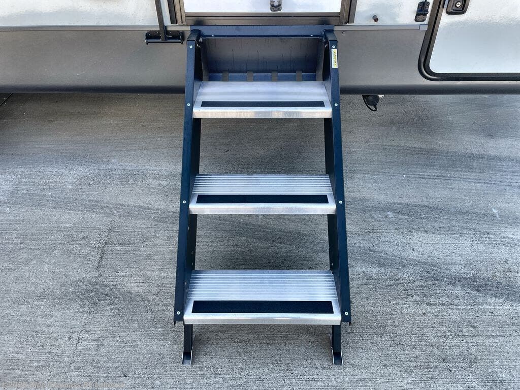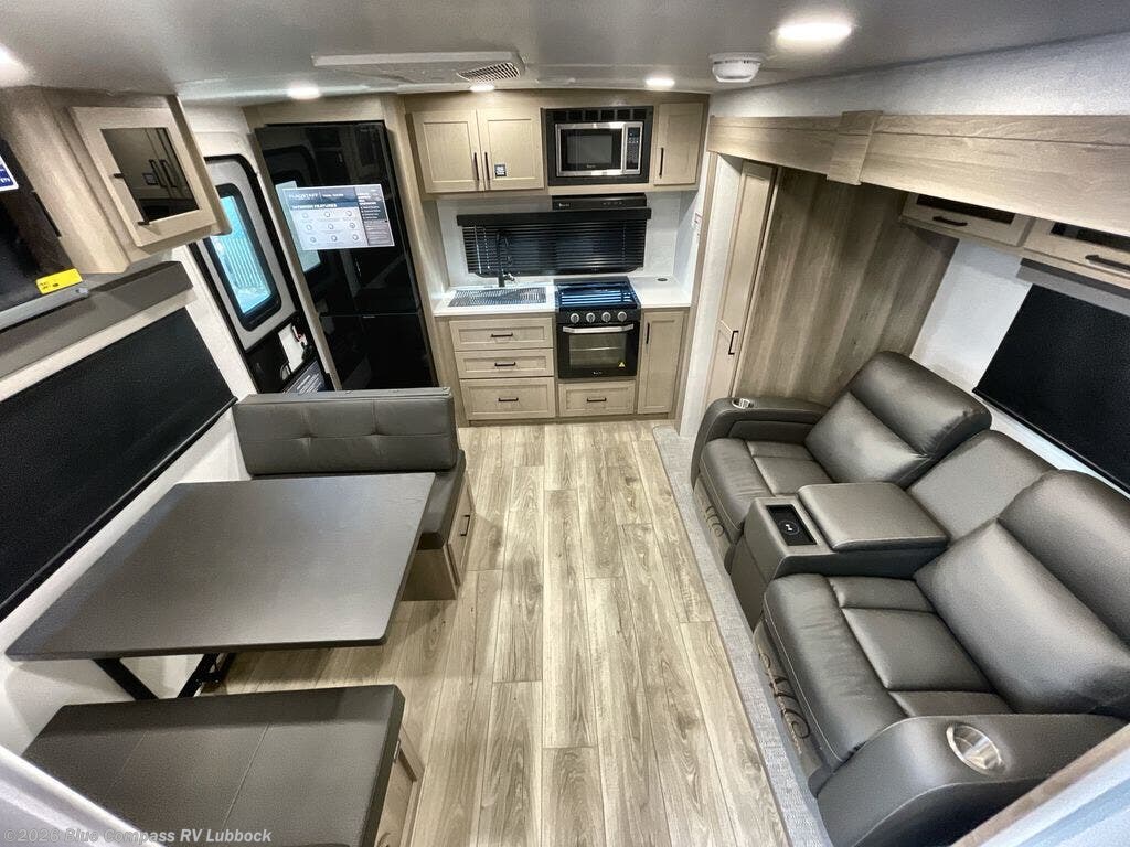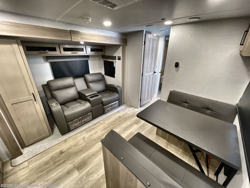 Trips to your favorite campground are made complete with this dual slide out, dual entry trailer! One entry goes straight into the front master bedroom where you'll find an RV queen bed with flip-up storage, a wardrobe slide out, and easy access into the walk-through bath. Once you're through the bath, you'll find the main living area, rear kitchen, and the second entry door at the back. Your crew can play a game at the 39" booth dinette or relax on the theater seat across from the TV. The kitchen includes everything you need to prepare meals in the morning, including a three burner cooktop and microwave oven, plus a 12V refrigerator and a pantry for food storage.
