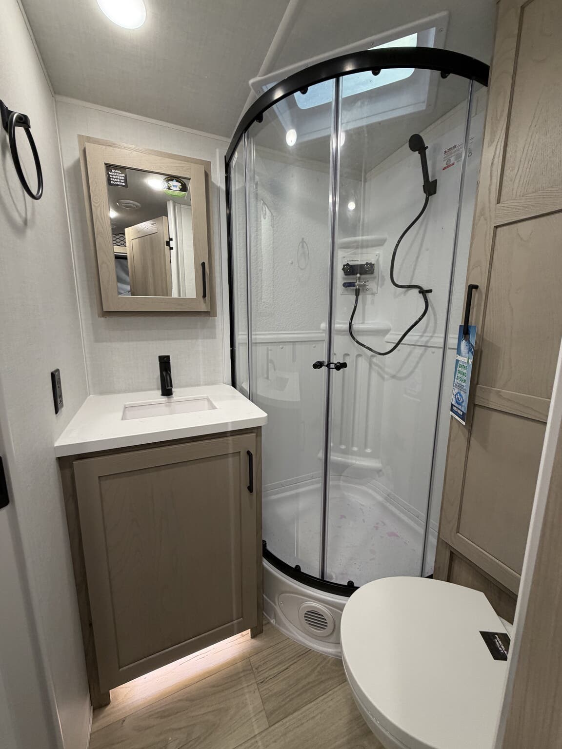 Dinette Bed, Glass Shower Door, Kitchen Sink, Pantry, Queen Bed, Removable Table, Roof Vents, Shower, Sofa Bed, U-Shaped Dinette