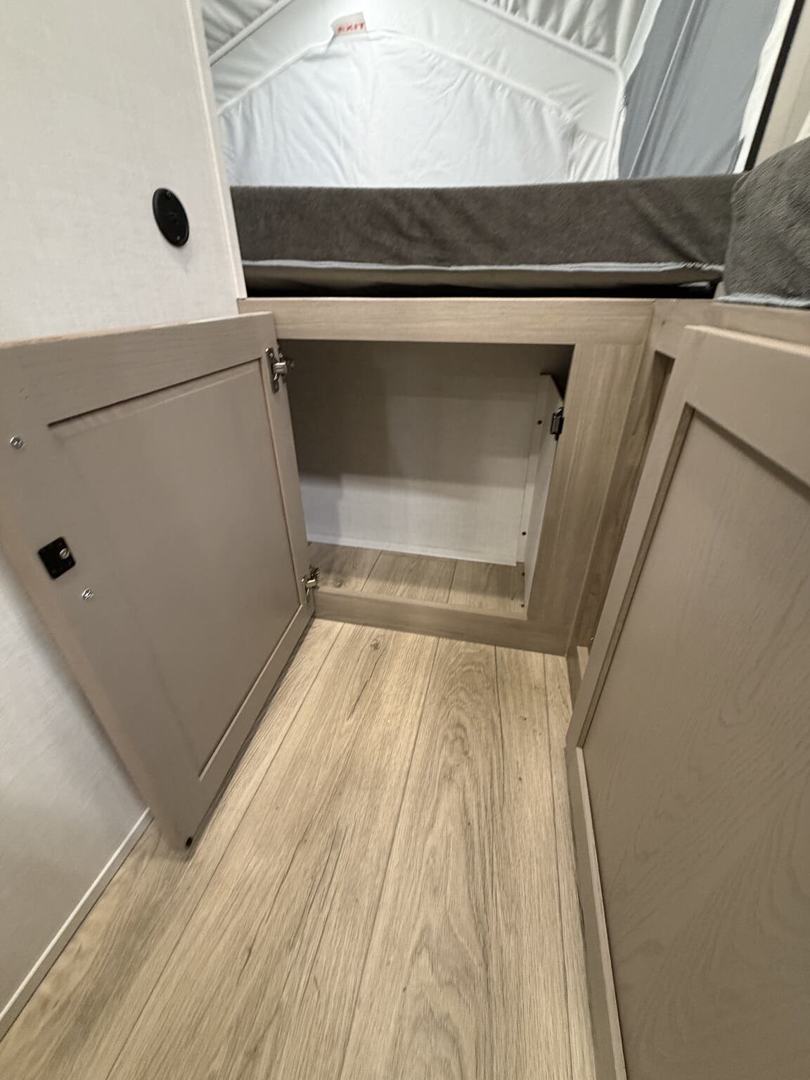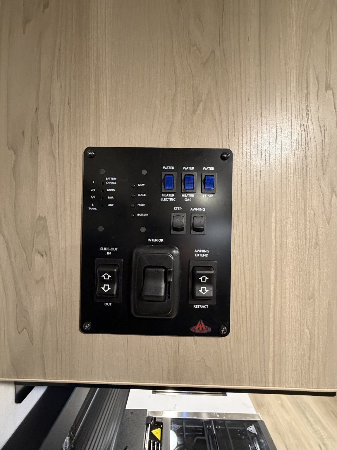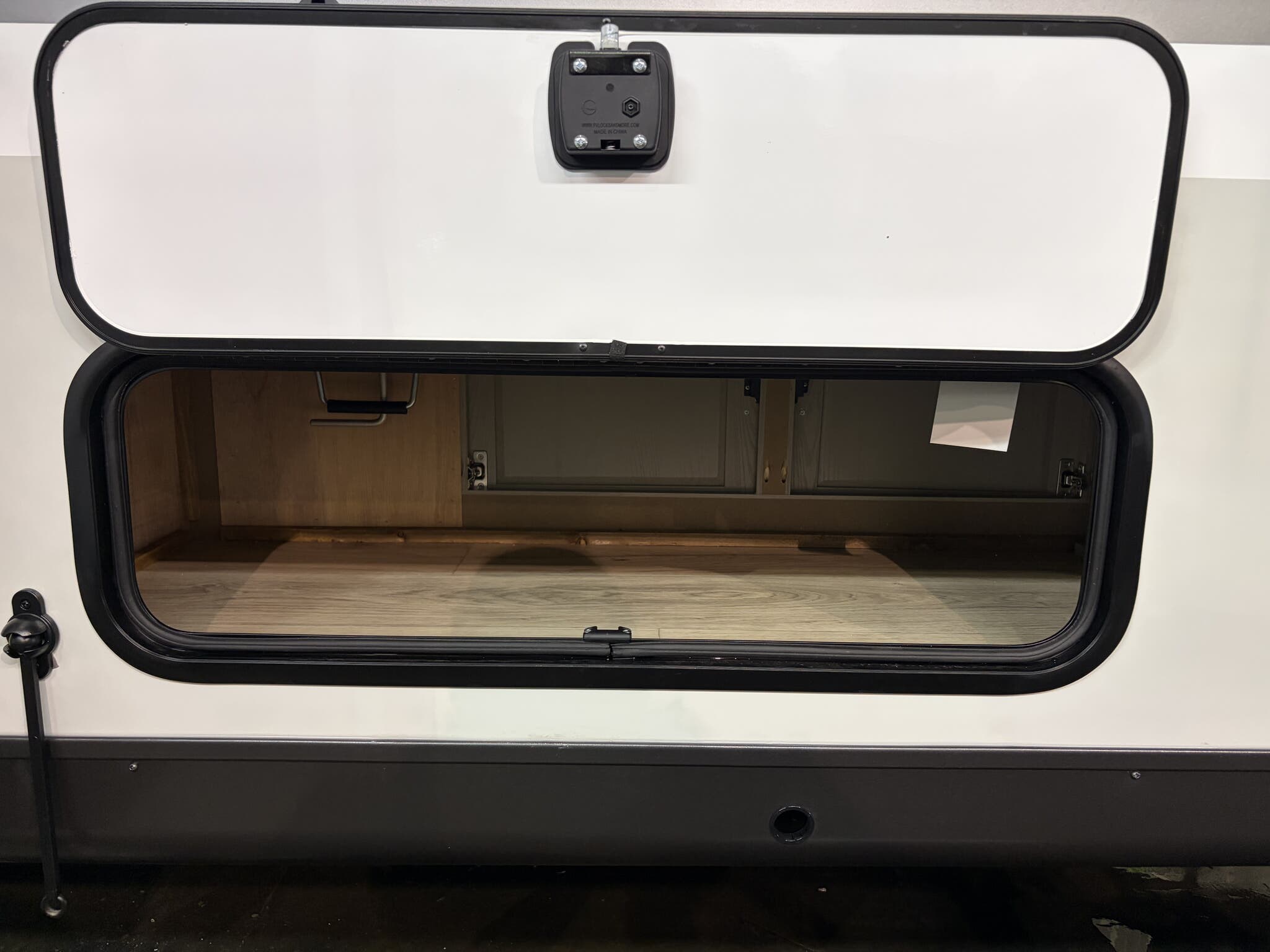 - Exterior reliability: power awning, slam latch baggage doors, enclosed underbelly, stabilizer jacks