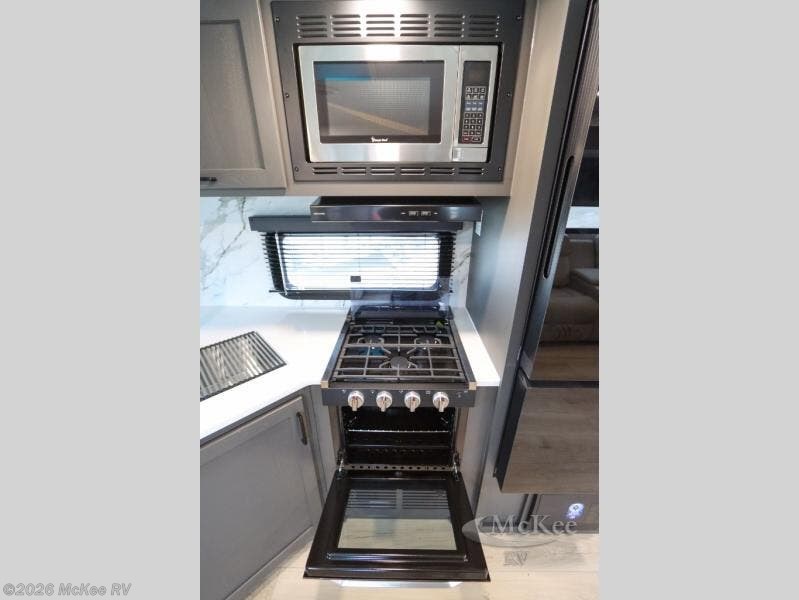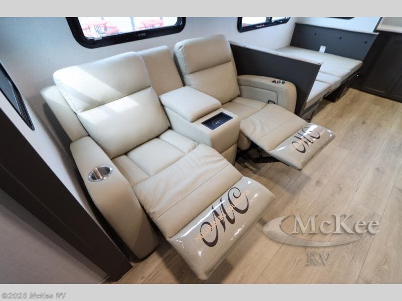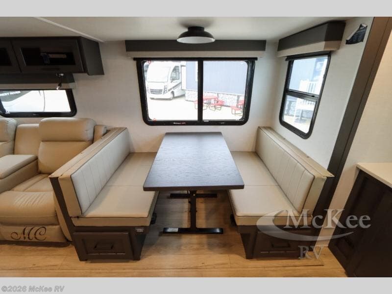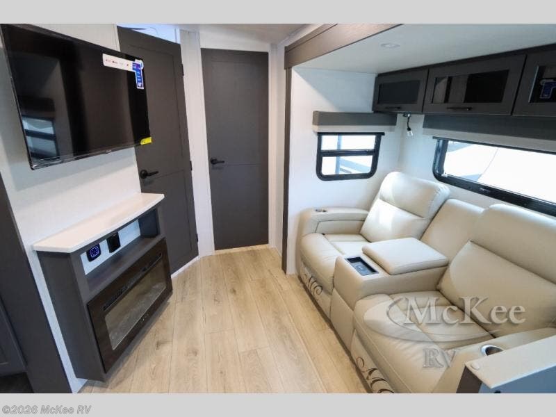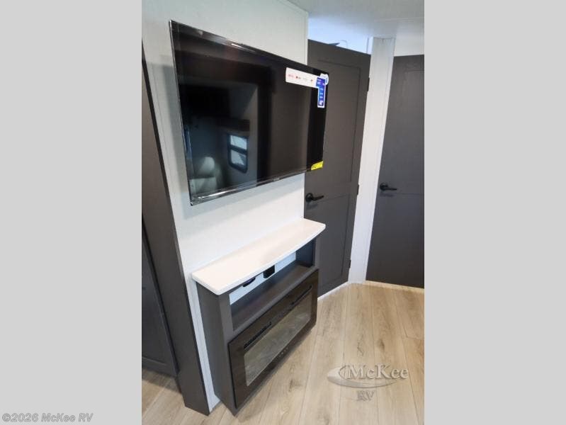 This is the perfect couples trailer with a spacious living and kitchen area and a rear bedroom which includes the second exterior entry/exit door! The bedroom also provides a slide out queen bed, a wardrobe and an optional TV, plus windows for great views and access to the double entry bathroom. The front kitchen gives the cook counter space and cabinetry for dishes and such, plus all the appliances needed to make warm meals and store leftovers. You can dine at the booth dinette, relax on the 67" theater seating and watch the Smart TV while enjoying the fireplace.