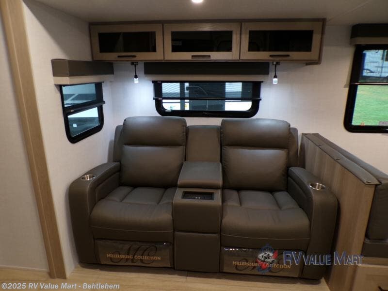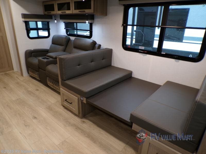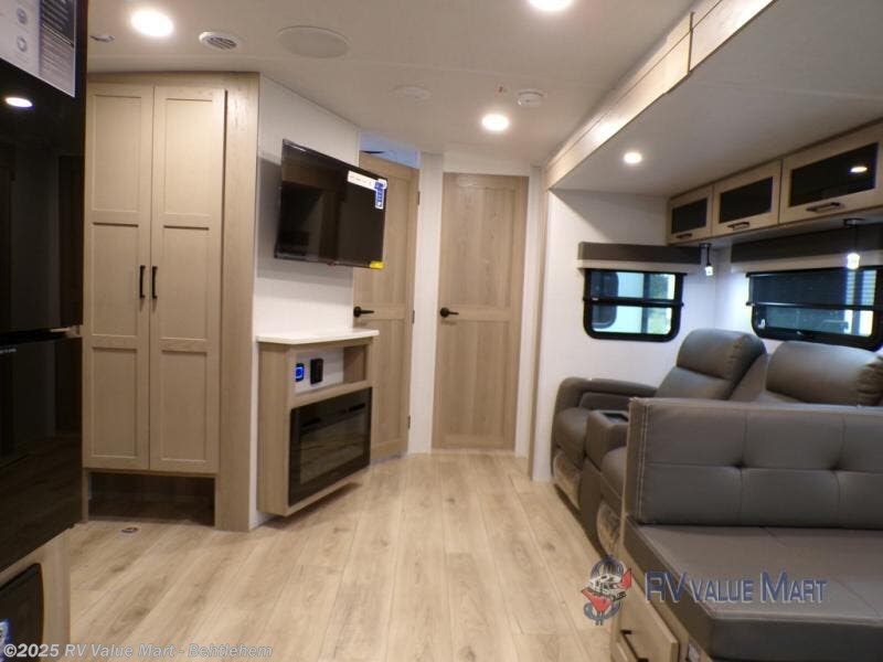 This is the perfect couples trailer with a spacious living and kitchen area and a rear bedroom which includes the second exterior entry/exit door! The bedroom also provides a slide out queen bed, a wardrobe and an optional TV, plus windows for great views and access to the double entry bathroom. The front kitchen gives the cook counter space and cabinetry for dishes and such, plus all the appliances needed to make warm meals and store leftovers. You can dine at the booth dinette, relax on the 67" theater seating and watch the Smart TV while enjoying the fireplace.