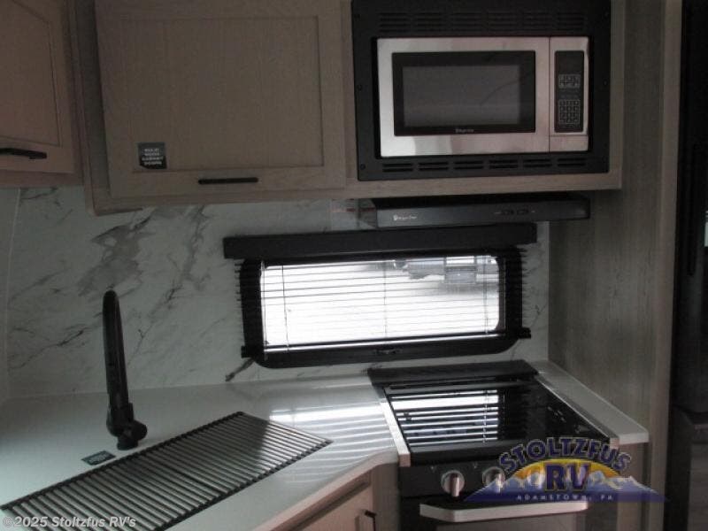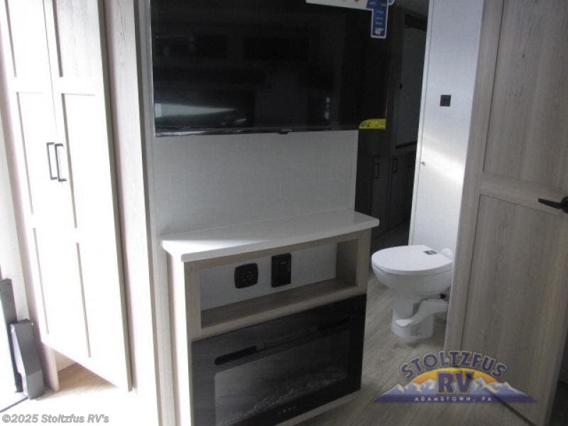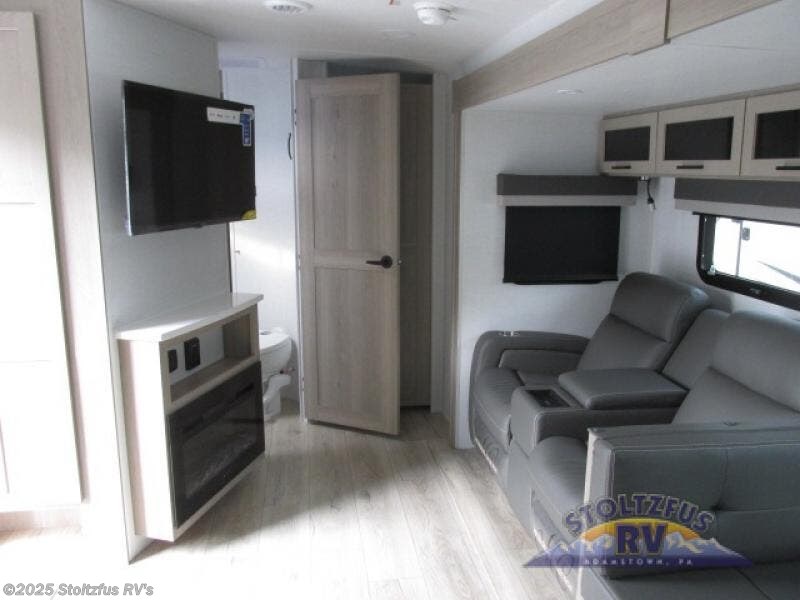 This is the perfect couples trailer with a spacious living and kitchen area and a rear bedroom which includes the second exterior entry/exit door! The bedroom also provides a slide out queen bed, a wardrobe and an optional TV, plus windows for great views and access to the double entry bathroom. The front kitchen gives the cook counter space and cabinetry for dishes and such, plus all the appliances needed to make warm meals and store leftovers. You can dine at the booth dinette, relax on the 67" theater seating and watch the Smart TV while enjoying the fireplace.