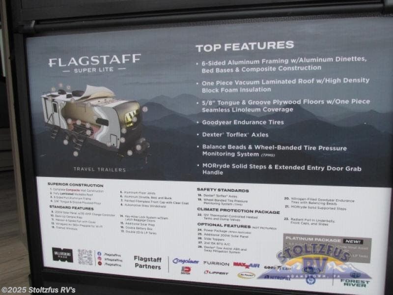 With any Flagstaff Super Lite travel trailer by Forest River, you can enjoy quality features with lightweight towing! The Climate Protection Package includes radiant foil in the front cap, underbelly, and slides, plus there are 12V thermostat-controlled heated tanks for added protection. The complete composite wall construction and 6-sided full-aluminum frame is ultra durable, and the RoadTech tire pressure monitoring adds safety. Each model also includes the Coast to Coast Package that comes with slam latch baggage doors, a high gloss fiberglass cap, Goodyear Endurance tires, plus a 200W solar panel with an optional additional 200W panel for more off grid capabilities. Inside, you'll love the roller shades, solid surface kitchen countertops, a shower miser system, and many more comforts!