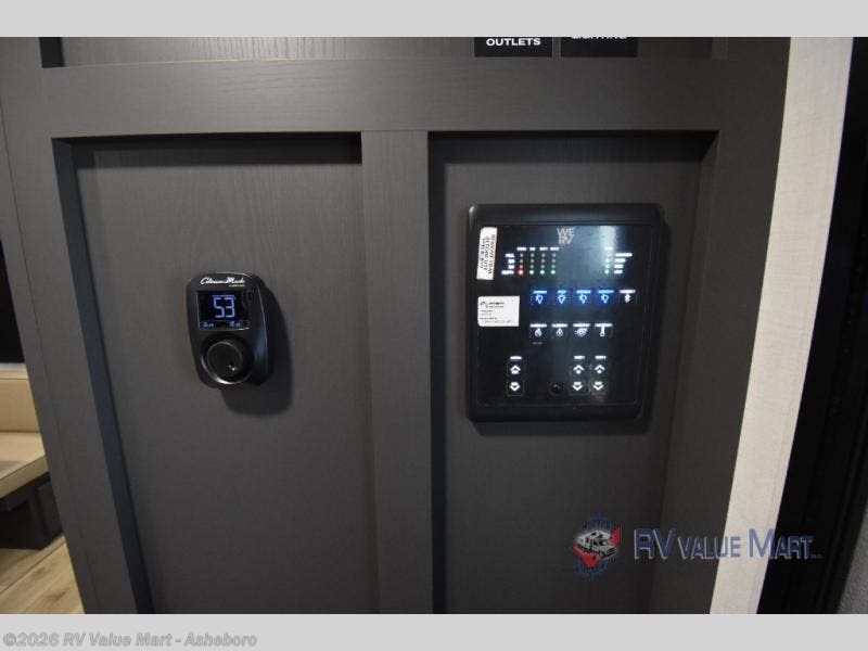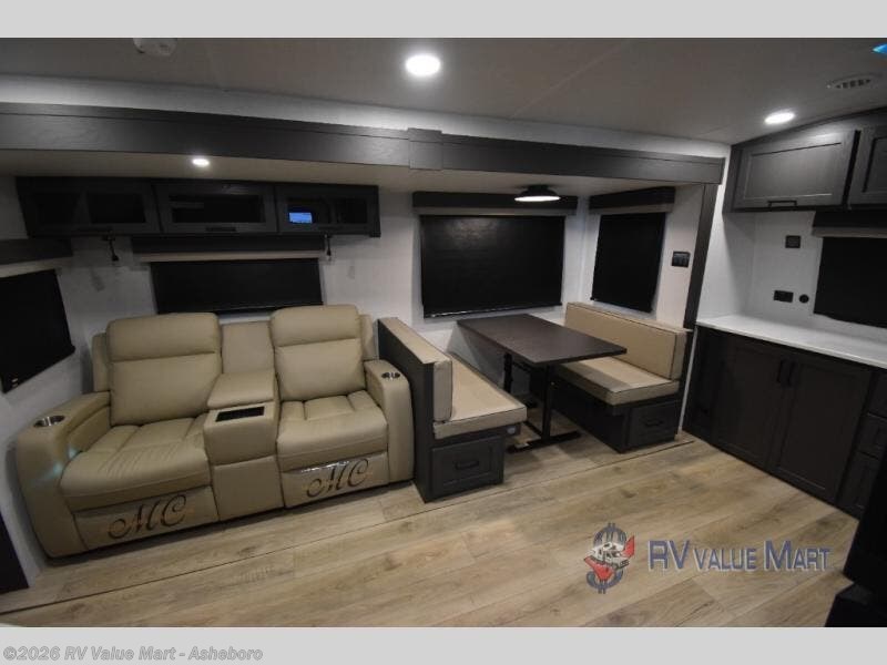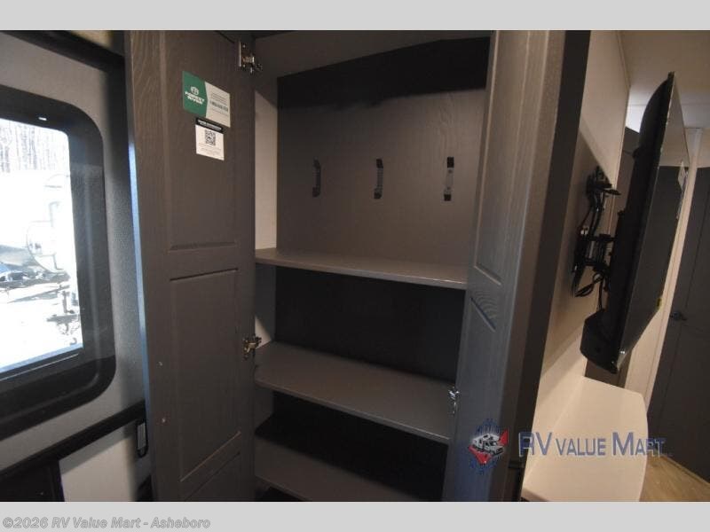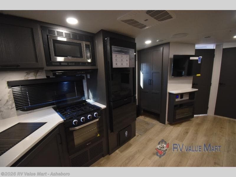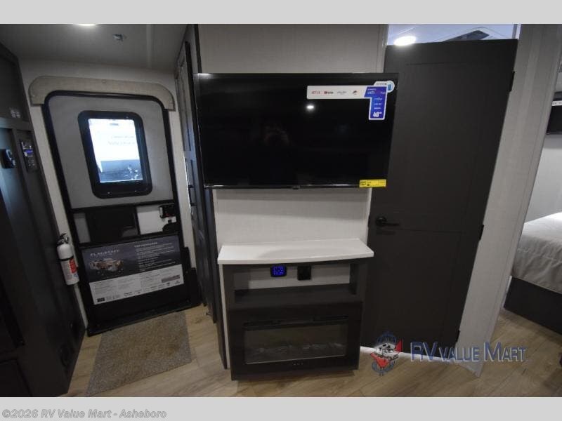 This is the perfect couples trailer with a spacious living and kitchen area and a rear bedroom which includes the second exterior entry/exit door! The bedroom also provides a slide out queen bed, a wardrobe and an optional TV, plus windows for great views and access to the double entry bathroom. The front kitchen gives the cook counter space and cabinetry for dishes and such, plus all the appliances needed to make warm meals and store leftovers. You can dine at the booth dinette, relax on the 67" theater seating and watch the Smart TV while enjoying the fireplace.