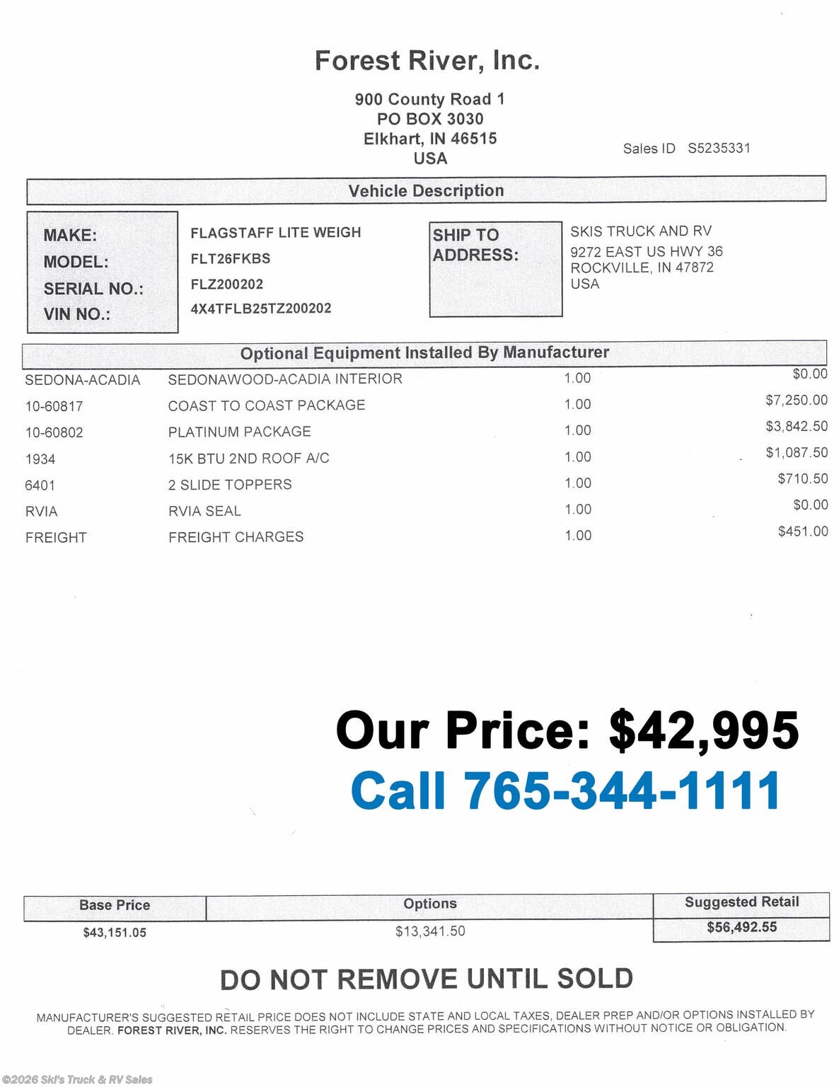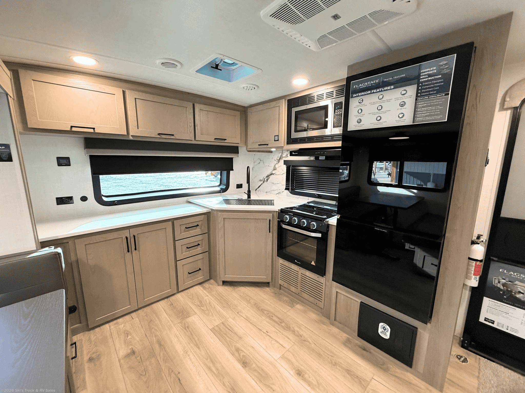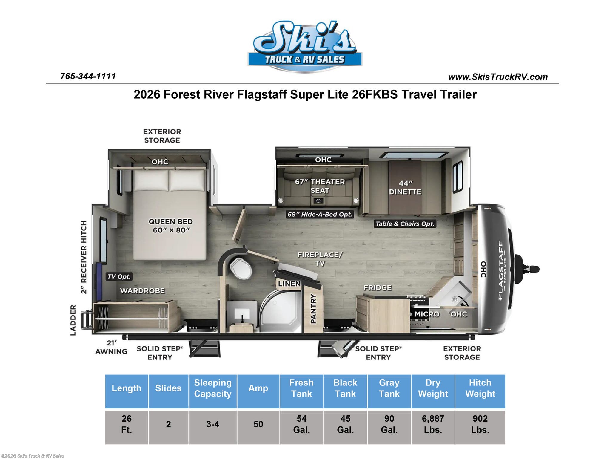 2026 Forest River Flagstaff Super Lite 26FKBS Travel Trailer with Platinum Package; 26 Foot; 2 Slides; Sleeps 3-4; Hitch Weight: 902 Lbs.; Dry Weight: 6,887 Lbs.; 50 Amp; Auto Leveling; 54 Gal. Fresh Water Cap.; 45 Gal. Black Water Cap.; 90 Gal. Gray Water Cap.; Two 30 Lbs. Propane Tanks w/Outside Port; Two ACs: 15,000 / 15,000 BTUs; 35,000 BTU Furnace; 10 C.F. (12V) Refrigerator; 6 Gal. Gas/Elec. Water Heater with Quick Recovery; Microwave; 3-Burner Stove/Oven; Solid Surface Countertops; Two TV Jacks; 40 In. TV; Speakers; One Fireplace; Booth Dinette; Pantry; Stainless Steel Sink; Theater Seats; Queen Bed; Large Wardrobe; One Bathroom with Shower; Porcelain Toilet; 21 Foot Power Awning with LED Lights; Solar (200W) Package with 1800W Inverter; Backup Camera Prep.; Dual Entry Doors; Outside Shower; Exterior Storage; Foldup Steps; Grab Handle; Roof Ladder; Rear Hitch; Key Alike System; Magnetic Door Holders; Battery Disconnect; Black Tank Flush; Climate Package; Heated Tanks; Fiberglass Sidewalls; Frameless Tinted Windows; Roller Shades; Goodyear Tires; Aluminum Wheels; Spare Tire; One Year Limited Warranty; Financing Available; Super Travel Trailer for the Price: $42,995. Call Skis Truck & RV Sales at 765-344-1111 or visit us at for more information.