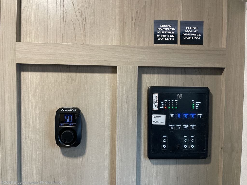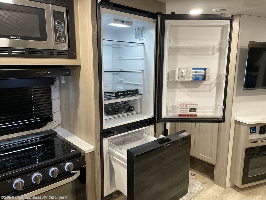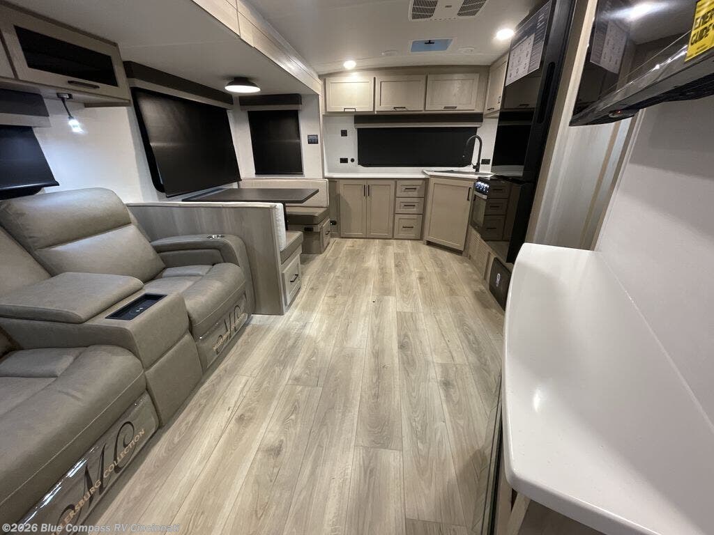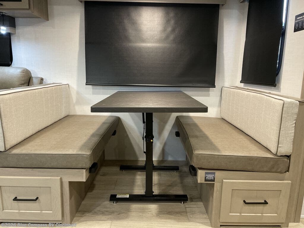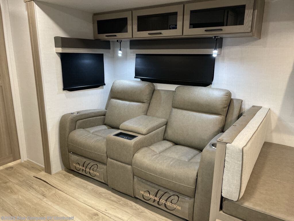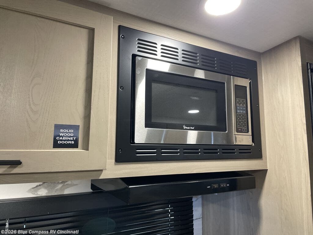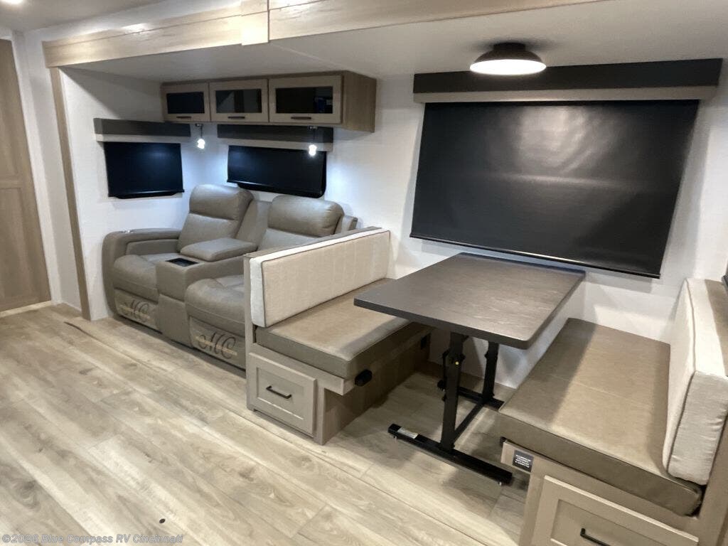 This is the perfect couples trailer with a spacious living and kitchen area and a rear bedroom which includes the second exterior entry/exit door! The bedroom also provides a slide out queen bed, a wardrobe and an optional TV, plus windows for great views and access to the double entry bathroom. The front kitchen gives the cook counter space and cabinetry for dishes and such, plus all the appliances needed to make warm meals and store leftovers. You can dine at the booth dinette, relax on the 67" theater seating and watch the Smart TV while enjoying the fireplace.