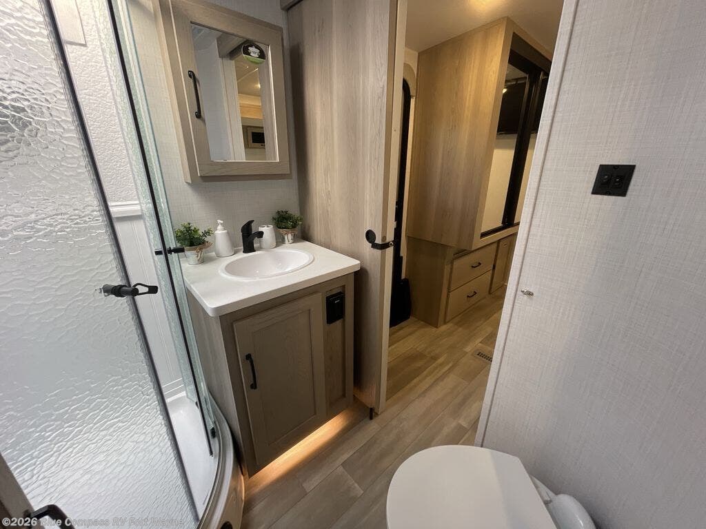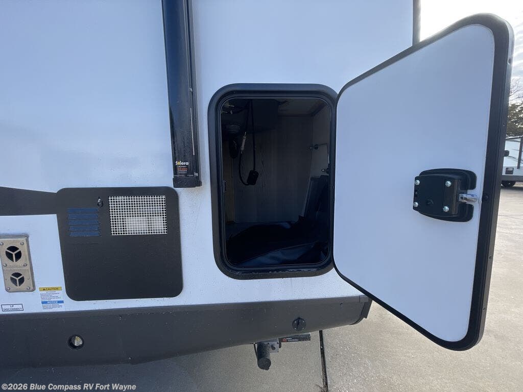 This is the perfect couples trailer with a spacious living and kitchen area and a rear bedroom which includes the second exterior entry/exit door! The bedroom also provides a slide out queen bed, a wardrobe and an optional TV, plus windows for great views and access to the double entry bathroom. The front kitchen gives the cook counter space and cabinetry for dishes and such, plus all the appliances needed to make warm meals and store leftovers. You can dine at the booth dinette, relax on the 67" theater seating and watch the Smart TV while enjoying the fireplace.