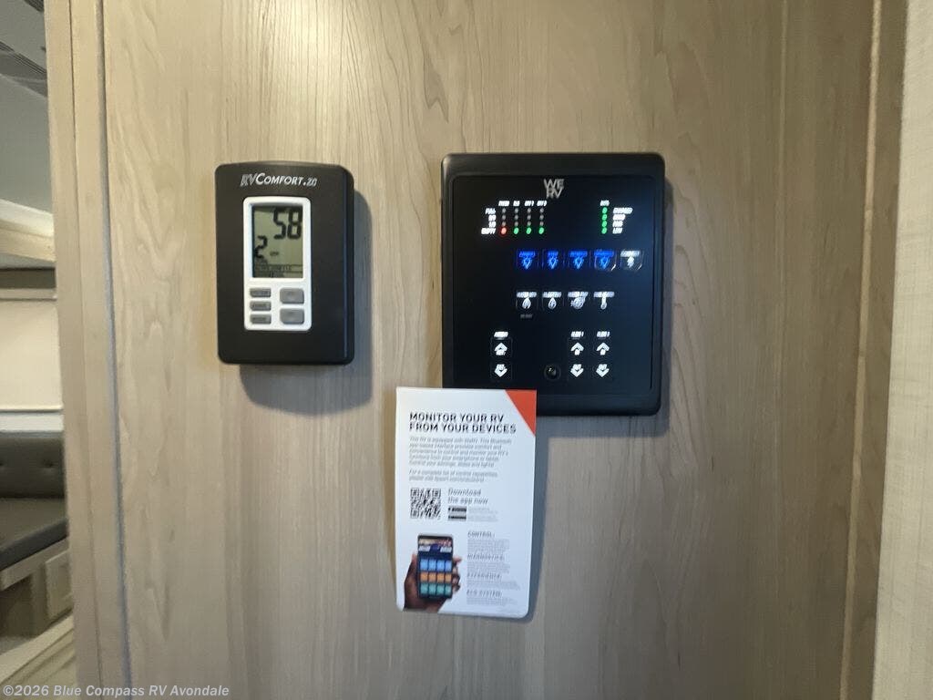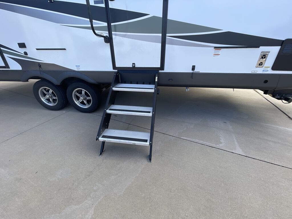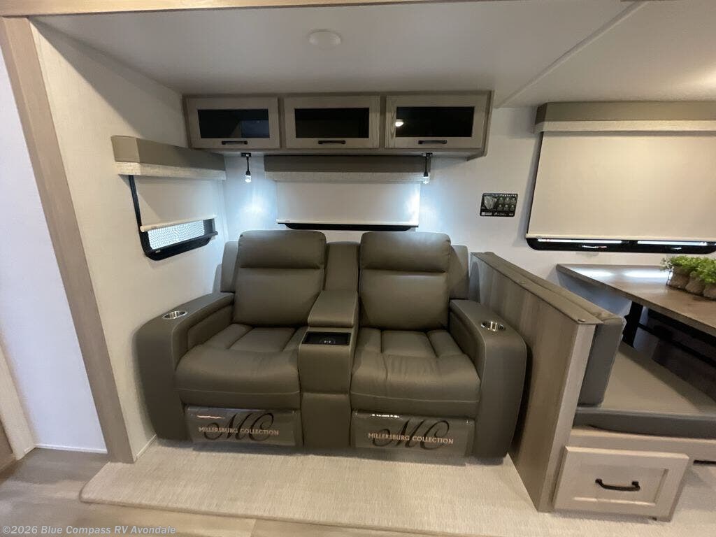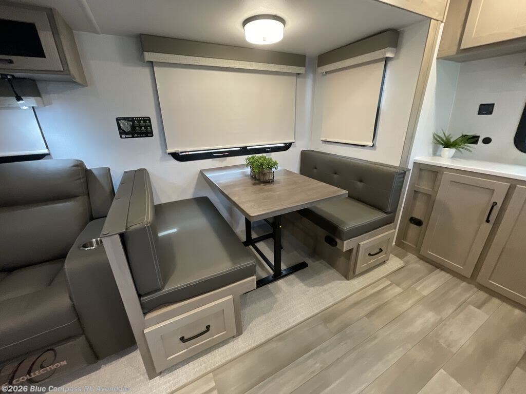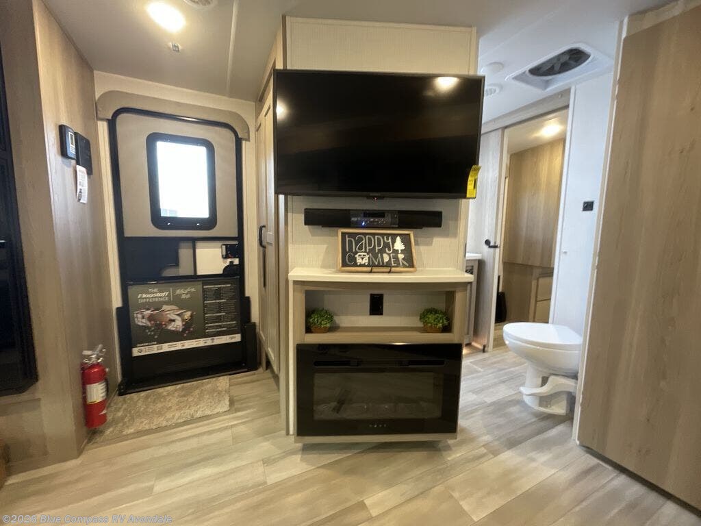 This is the perfect couples trailer with a spacious living and kitchen area and a rear bedroom which includes the second exterior entry/exit door! The bedroom also provides a slide out queen bed, a wardrobe and an optional TV, plus windows for great views and access to the double entry bathroom. The front kitchen gives the cook counter space and cabinetry for dishes and such, plus all the appliances needed to make warm meals and store leftovers. You can dine at the booth dinette, relax on the 67" theater seating and watch the Smart TV while enjoying the fireplace.
