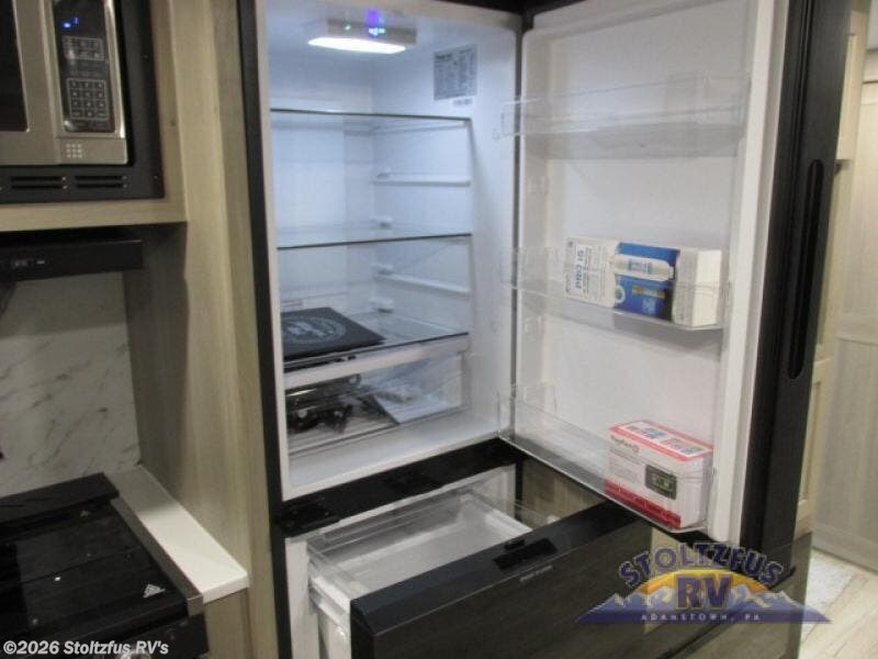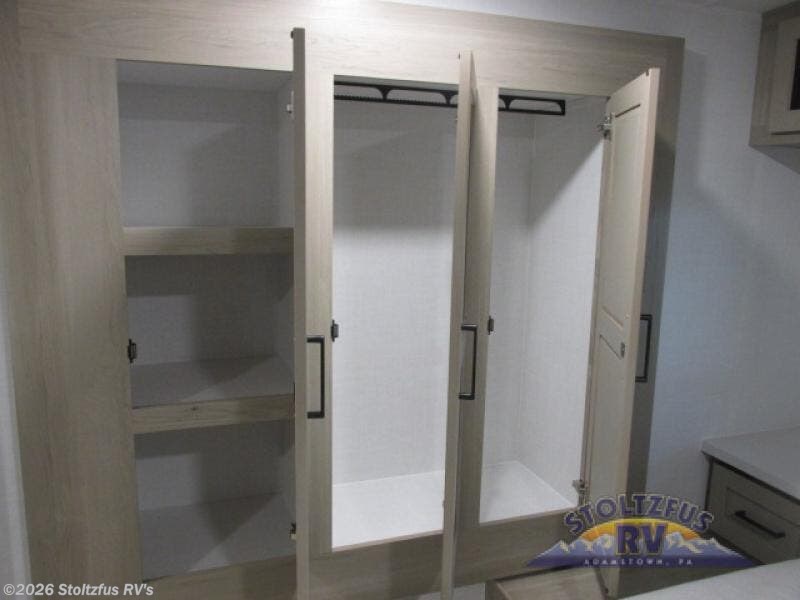 Enjoy inside comforts, and outside conveniences in this trailer. You can relax under the 21' power awning which offers an outdoor living area protected from the elements, and a pass-thru storage with an optional steel sliding tray gives you the option to easily access your gear. You'll find ample storage space inside as well, including a walk-in pantry by the entry door for convenience! The cook will have full amenities to make meals, and when you are ready to sleep, head to the front bedroom with a queen bed and plenty of storage, and a wardrobe slide out giving you more floor and storage space.