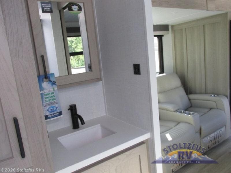 It will be so easy to enjoy time at the campground in this cozy travel trailer. The full kitchen includes a three burner gas oven, a microwave oven, and a 12V refrigerator to cook and store food, and the pantry will let you stock up on snacks. Your crew can get comfortable on the theater seat or play a game at the 39" dream dinette, and there is a smart TV with a lift here to make it a movie night. The walk-thru bath will let you freshen up each day, and the queen bed slide out in the rear bedroom is sure to bring comfort. You will also find one of the dual entry doors here for convenience plus a wardrobe for clothes storage and an optional TV if you want to add a television. The exterior is just as accommodating with its pass-thru storage, 2" receiver hitch, and 21' power awning!