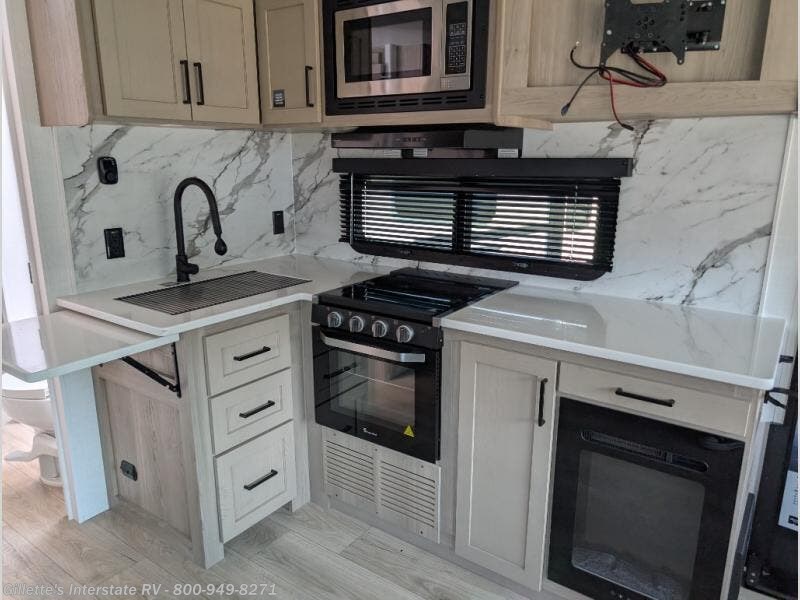 It will be so easy to enjoy time at the campground in this cozy travel trailer. The full kitchen includes a three burner gas oven, a microwave oven, and a 12V refrigerator to cook and store food, and the pantry will let you stock up on snacks. Your crew can get comfortable on the theater seat or around the rear U-shaped dinette, and there is a smart TV here to make it a movie night. The walk-thru bath will let you freshen up each day, and the queen bed in the front bedroom is sure to bring comfort. You will also find one of the dual entry doors here for convenience plus a wardrobe slide out for more storage and floor space. The exterior is just as accommodating with its pass-thru storage, 2" receiver hitch, and 21' power awning!
