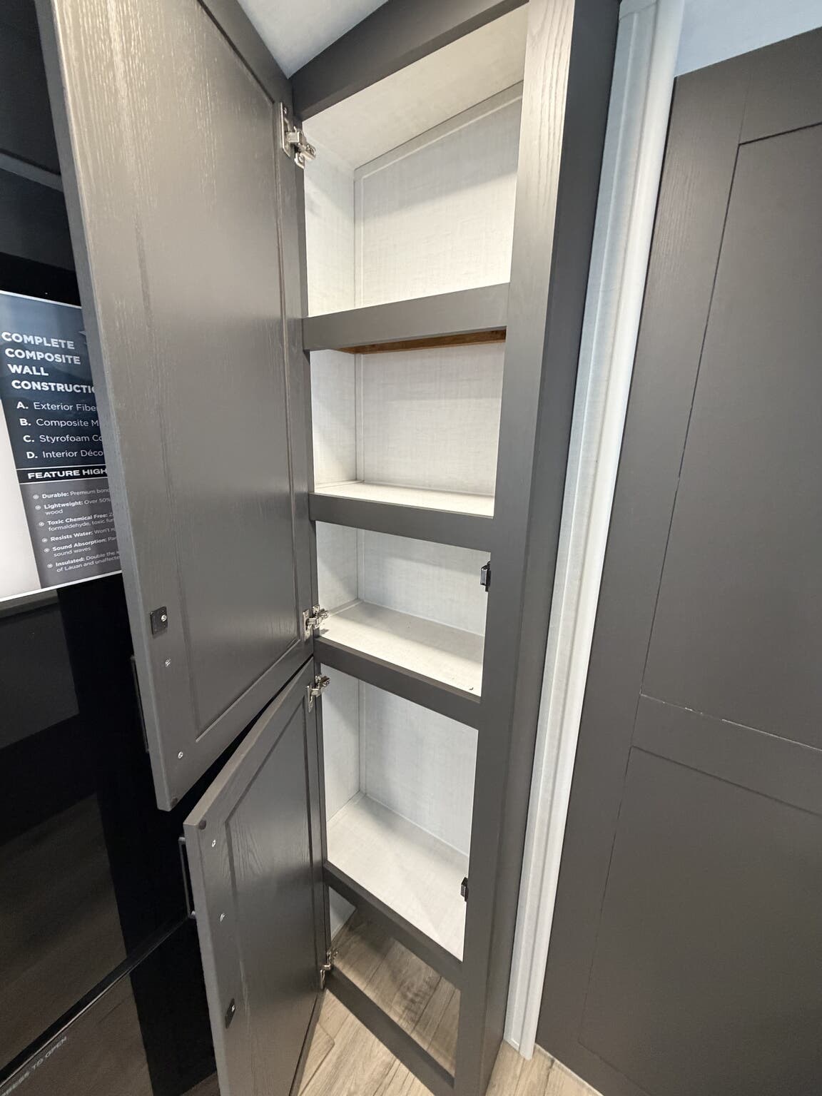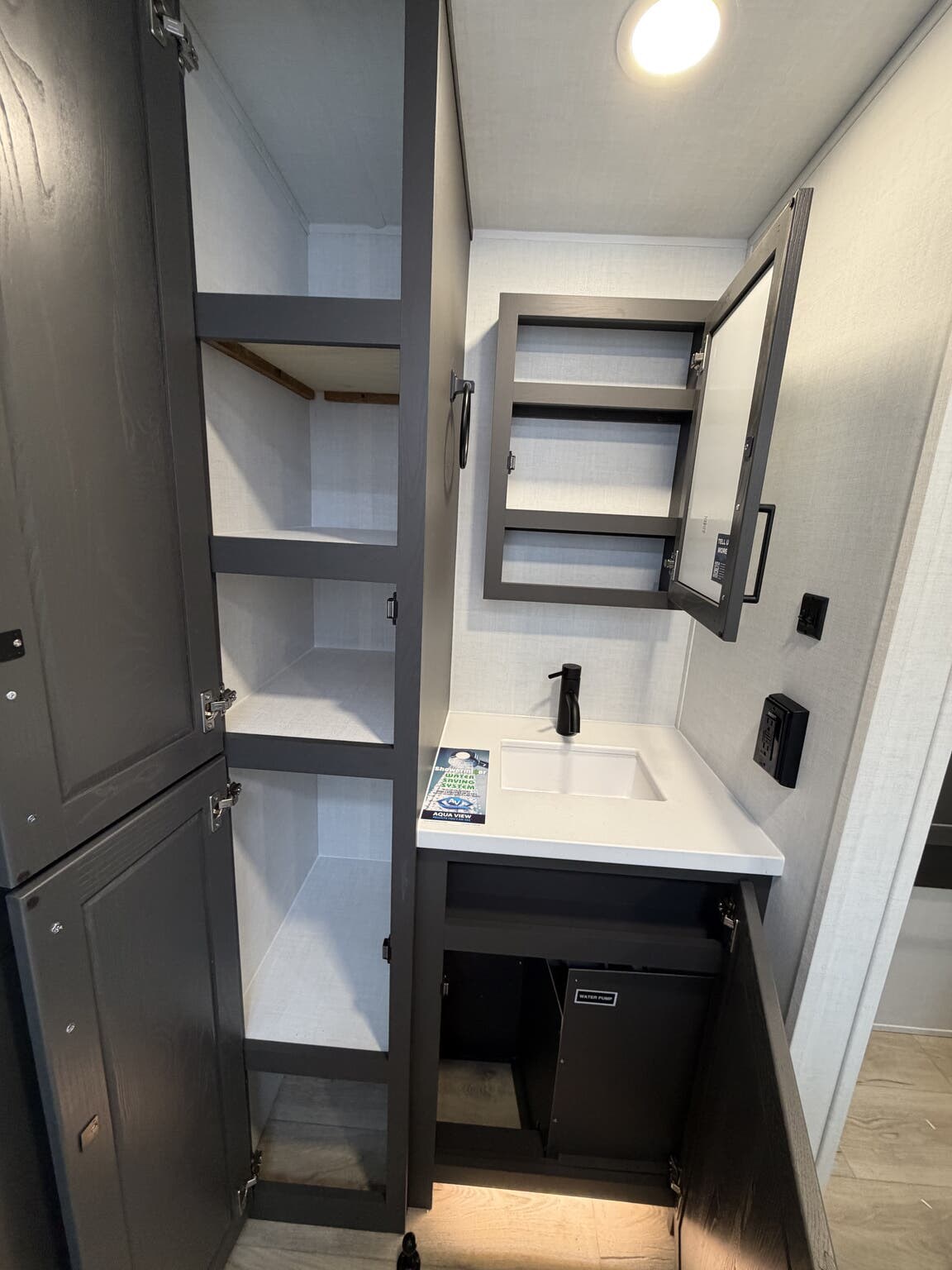 Dinette, Dinette Bed, Fireplace, Glass Shower Door, Kitchen Sink, Medicine Cabinet, Overhead Cabinetry, Pantry, Pocket Door(s), Queen Bed, Queen Mattress, Roof Vents, Shower, Solid Surface Countertops, Theater Seating, Toilet, U-Shaped Dinette, Vanity
