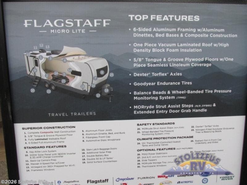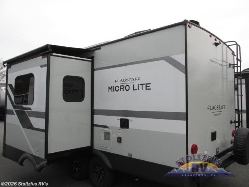 With any Flagstaff Micro Lite travel trailer by Forest River you will enjoy lightweight towing, durable construction, and added interior comforts to make each trip memorable! Each model features RoadTech tire pressure monitoring, Dexter Torflex axles, and nitrogen-filled Goodyear endurance tires for smooth towing from home to campground. The 6-sided aluminum framed construction provides a strong foundation so you can enjoy your RV for years to come, plus the radiant foil in the front cap, underbelly and slides help insulate your trailer. Additional exterior features include a 200W solar panel, back-up camera prep, frameless windows, and slam baggage doors. Each model includes the Great Expectations Package with roller shades, solid surface kitchen countertops, and hidden hinge cabinet doors. There is also an exterior hot/cold water port, outside speakers, a power tongue jack and stabilizer jacks, plus many more conveniences.