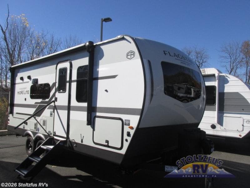 With any Flagstaff Micro Lite travel trailer by Forest River you will enjoy lightweight towing, durable construction, and added interior comforts to make each trip memorable! Each model features RoadTech tire pressure monitoring, Dexter Torflex axles, and nitrogen-filled Goodyear endurance tires for smooth towing from home to campground. The 6-sided aluminum framed construction provides a strong foundation so you can enjoy your RV for years to come, plus the radiant foil in the front cap, underbelly and slides help insulate your trailer. Additional exterior features include a 200W solar panel, back-up camera prep, frameless windows, and slam baggage doors. Each model includes the Great Expectations Package with roller shades, solid surface kitchen countertops, and hidden hinge cabinet doors. There is also an exterior hot/cold water port, outside speakers, a power tongue jack and stabilizer jacks, plus many more conveniences.