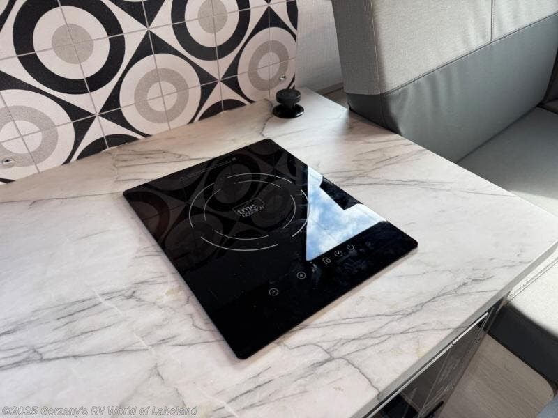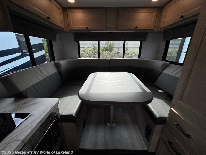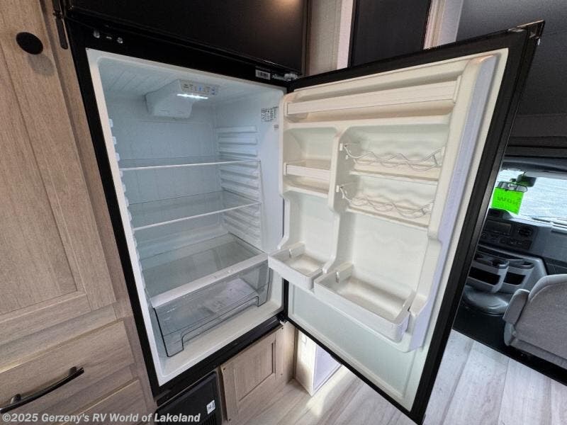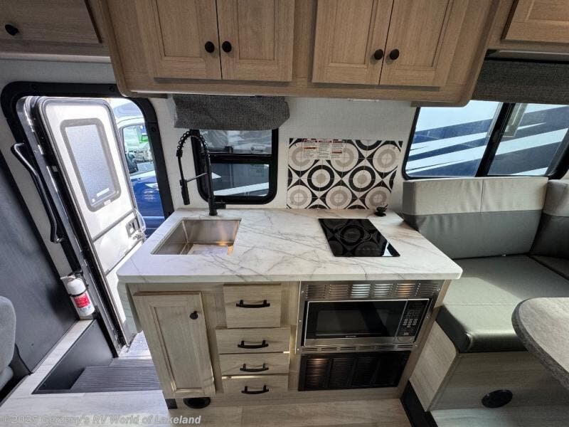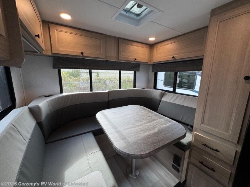 This motorhome is perfect for couples or small families. The bunk over the cab provides a cozy sleeping area, while the U-dinette offers additional sleeping space for guests or family members. The 12V TV is perfect for relaxing in the evenings or enjoying your favorite shows on the go. Plus, the wet bath is a practical and efficient space, making it easy to get ready in the morning or freshen up after a long day. Further, the kitchen is equipped with a 12V fridge, convection microwave/air fryer, and flip-up countertop, providing ample space to prepare meals and snacks. The pantry offers additional storage for your food and cooking essentials. Additionally, overhead cabinets throughout the unit provide plenty of storage for your belongings.