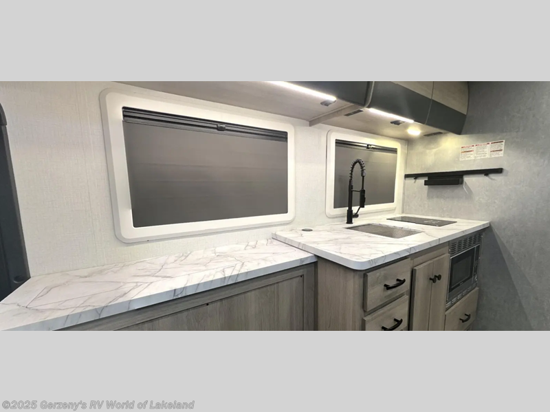 Trips across the state are made cozy in this single slide out coach for two! Once you've parked for the day, you can make lunch on the recessed induction cooktop or in the convection microwave. The sofa slide out provides a place to relax, and the Murphy bed can be folded out when you're ready for some shut-eye. You will appreciate how spacious the full rear bath is, and there is a wardrobe plus a linen closet here for ample storage. The cab-over bunk is only available with the Trekker Cap option; see dealer for more details.