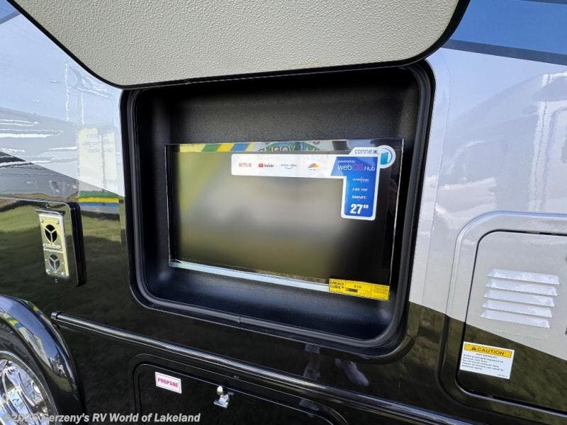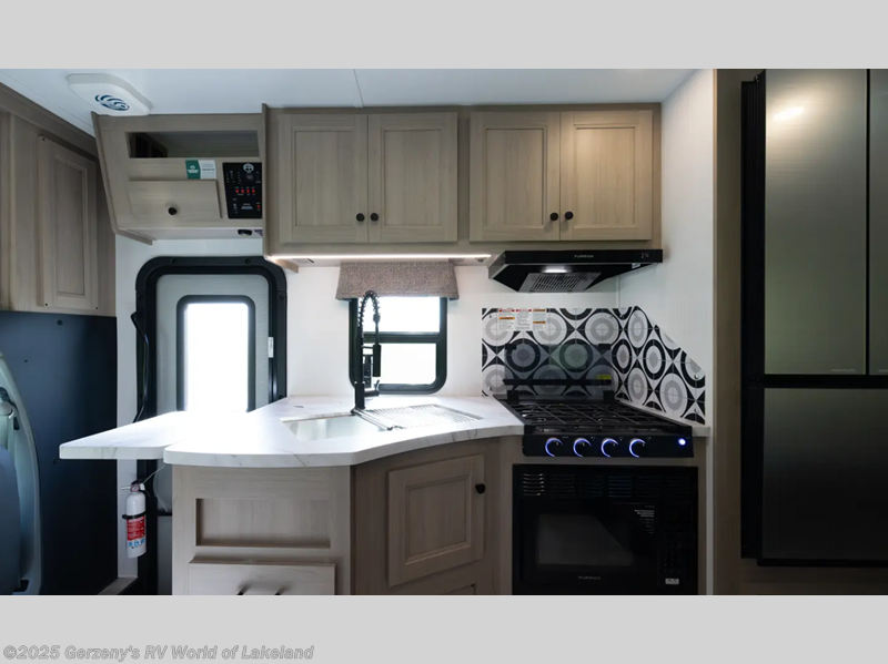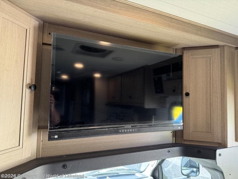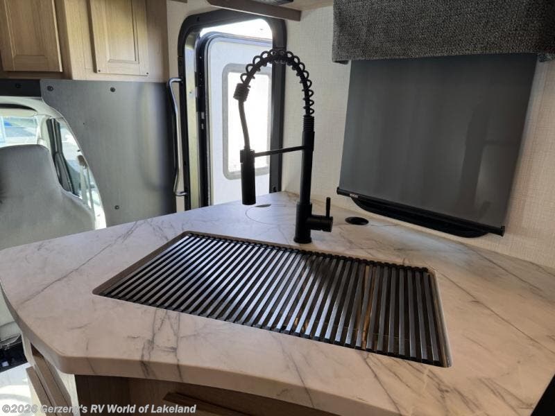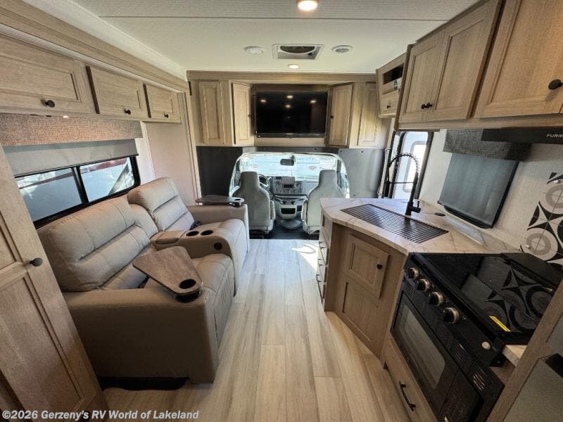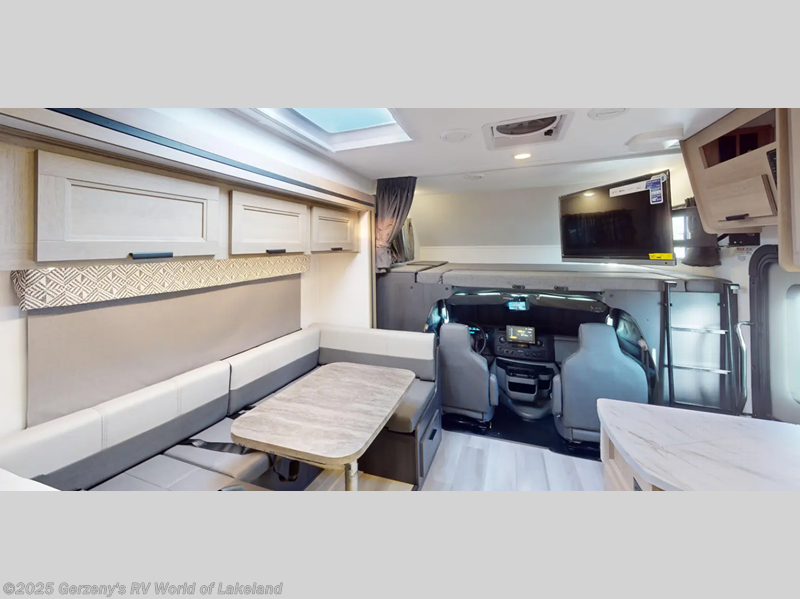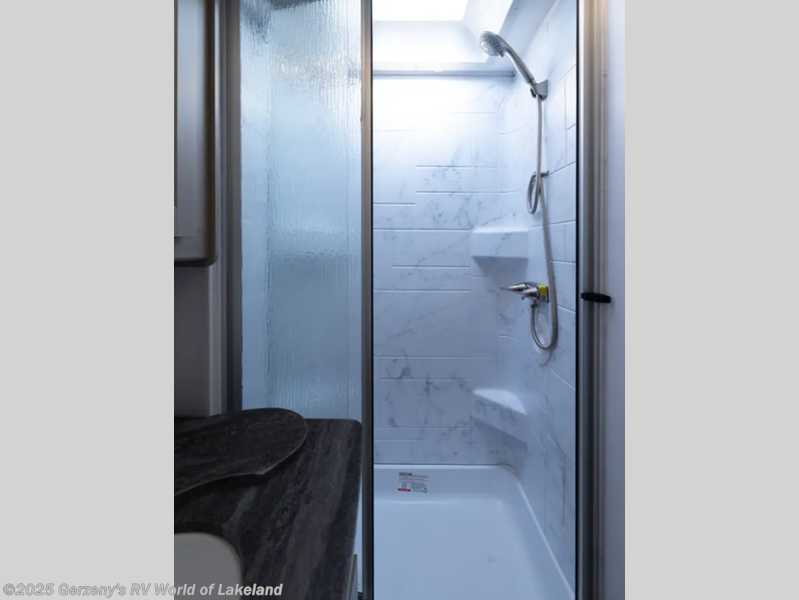 You will feel right at home traveling in this motorhome! The full rear bathroom has a 24" x 36" shower to freshen up in, plus storage space and a private toilet so you both can use this room at once. Inside the bedroom is a 60" x 74" queen bed slide with a wedge mattress for more space, and a 12V TV for movies in bed. Prepare your best meals with the three burner cooktop and the 10.7 cu. ft. 12V refrigerator or throw some leftovers in the undermount 1.3 cu. ft. convection microwave, then enjoy it at the U-shaped dinette slide. The 60" x 80" bunk over cab mat offers a comfortable place to sleep but if you don't need the extra sleeping space, you can switch it out for the optional Trekker cap with a built-in entertainment center, plus there is an optional outside 12V TV to add!