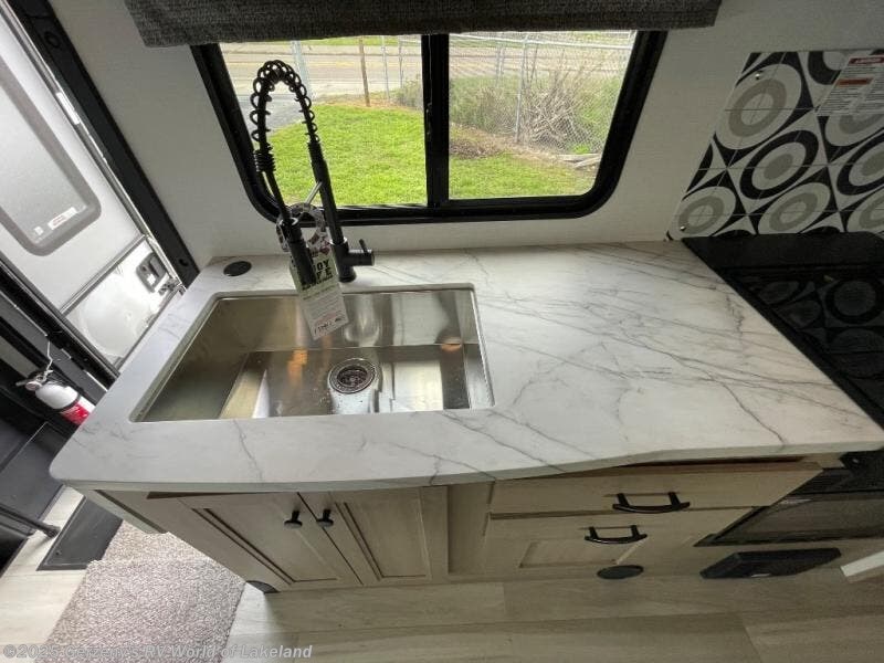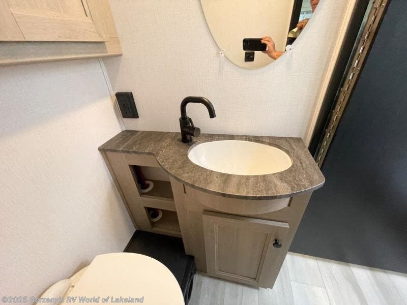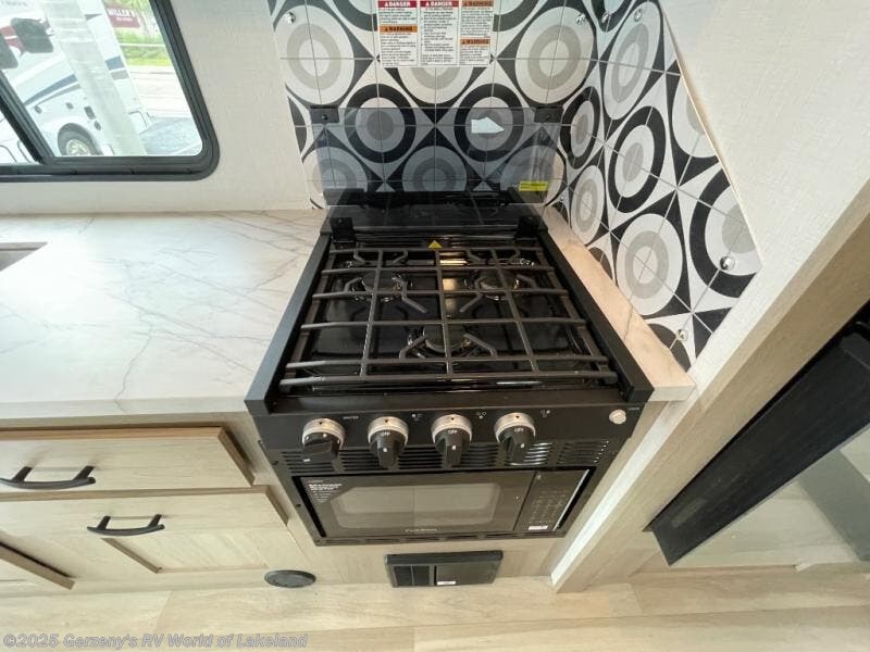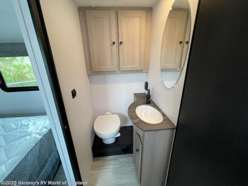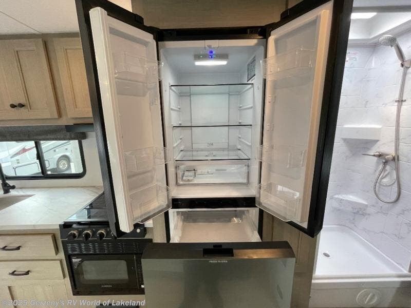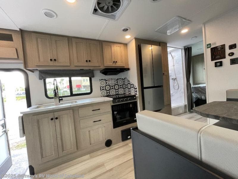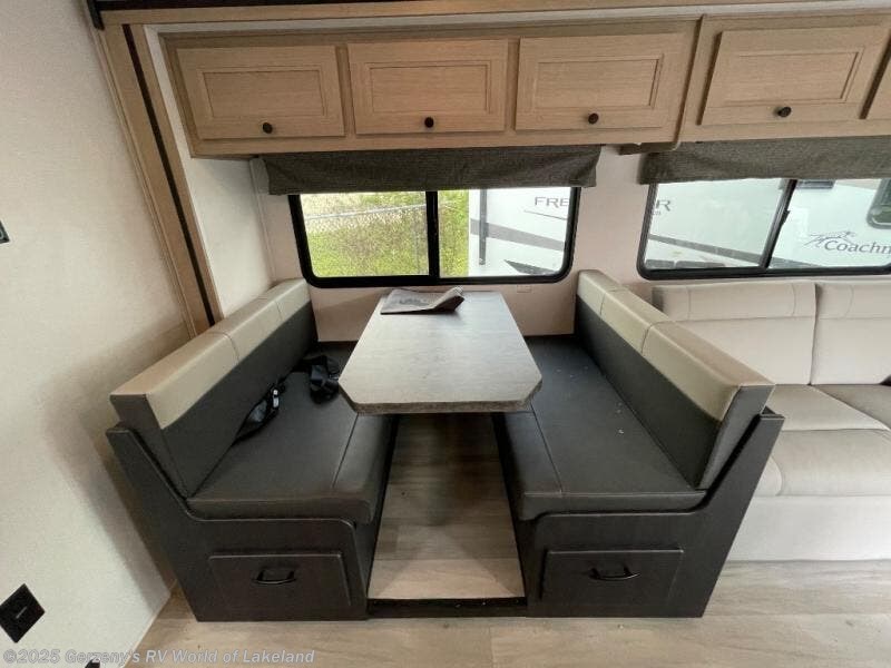 You and your favorite person will love this coach for many reasons including having your own private bedroom with a split bathroom, a walk-around queen bed, plus your own wardrobe. The split bathroom is pretty handy since one person can get ready in the private toilet and sink room while another is taking a shower. The kitchen offers a 10.7 cu. ft. 12V refrigerator, a convection microwave, a recessed three-burner range, soft touch self-closing drawer guides and a cordless 12V charging plate. You will have overhead cabinets and a pantry for storage. The slide out sofa and booth dinette offer a great place to relax and dine plus gives you more floor space. And the queen bunk over the cab will be a popular sleeping space for overnight guests.