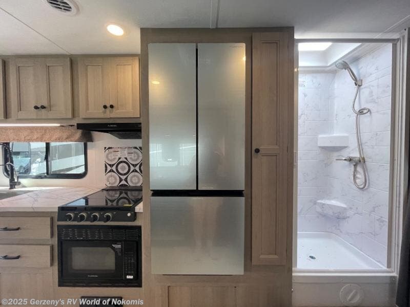 You and your favorite person will love this coach for many reasons including having your own private bedroom with a split bathroom, a walk-around queen bed, plus your own wardrobe. The split bathroom is pretty handy since one person can get ready in the private toilet and sink room while another is taking a shower. The kitchen offers a 10.7 cu. ft. 12V refrigerator, a convection microwave, a recessed three-burner range, soft touch self-closing drawer guides and a cordless 12V charging plate. You will have overhead cabinets and a pantry for storage. The slide out sofa and booth dinette offer a great place to relax and dine plus gives you more floor space. And the queen bunk over the cab will be a popular sleeping space for overnight guests.