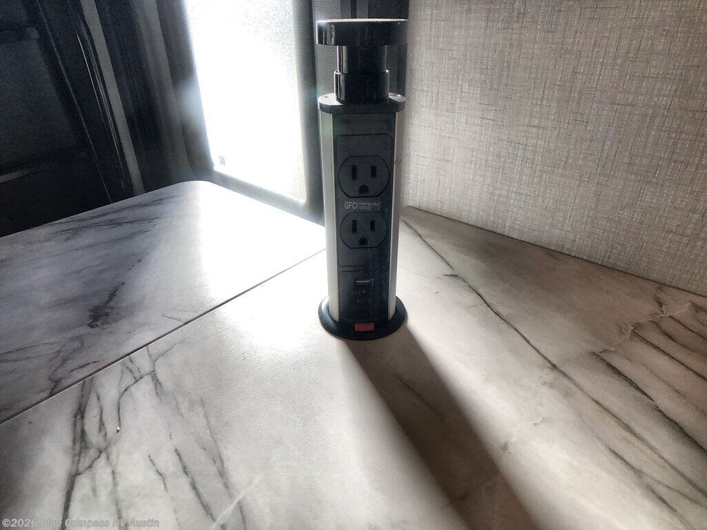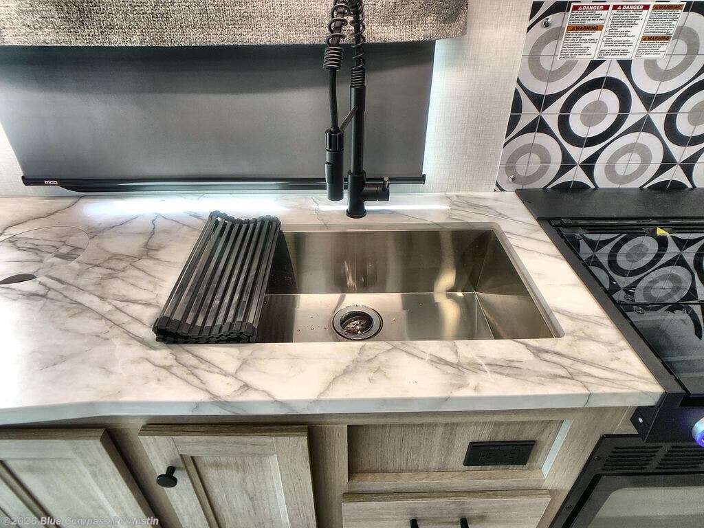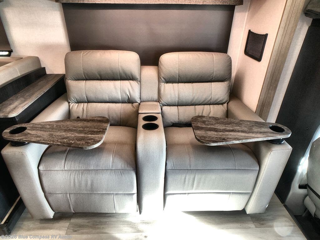 Escape the hustle and bustle of everyday life with this motorhome! It features a 60" x 80" bunk over cab mat which can be switched out for an optional Trekker cap with a built-in entertainment center. The sofa and U-shaped dinette slide offer comfortable places to enjoy meals, socialize, and even sleep once converted. Prepare your best meals with the 10.7 cu. ft. 12V refrigerator, the three burner cooktop, the flip-up countertop, and even the 1.3 cu. ft. undermount convection microwave. The separated bathroom has a 24" x 36" shower across from a toilet with a sink and countertop space, plus it leads directly into the rear private bedroom which has a 60" x 74" queen bed slide across from a linen/12V TV area with wardrobes on either side. You can even add an optional outside 12V TV and stay protected by the 15' 6" power awning!