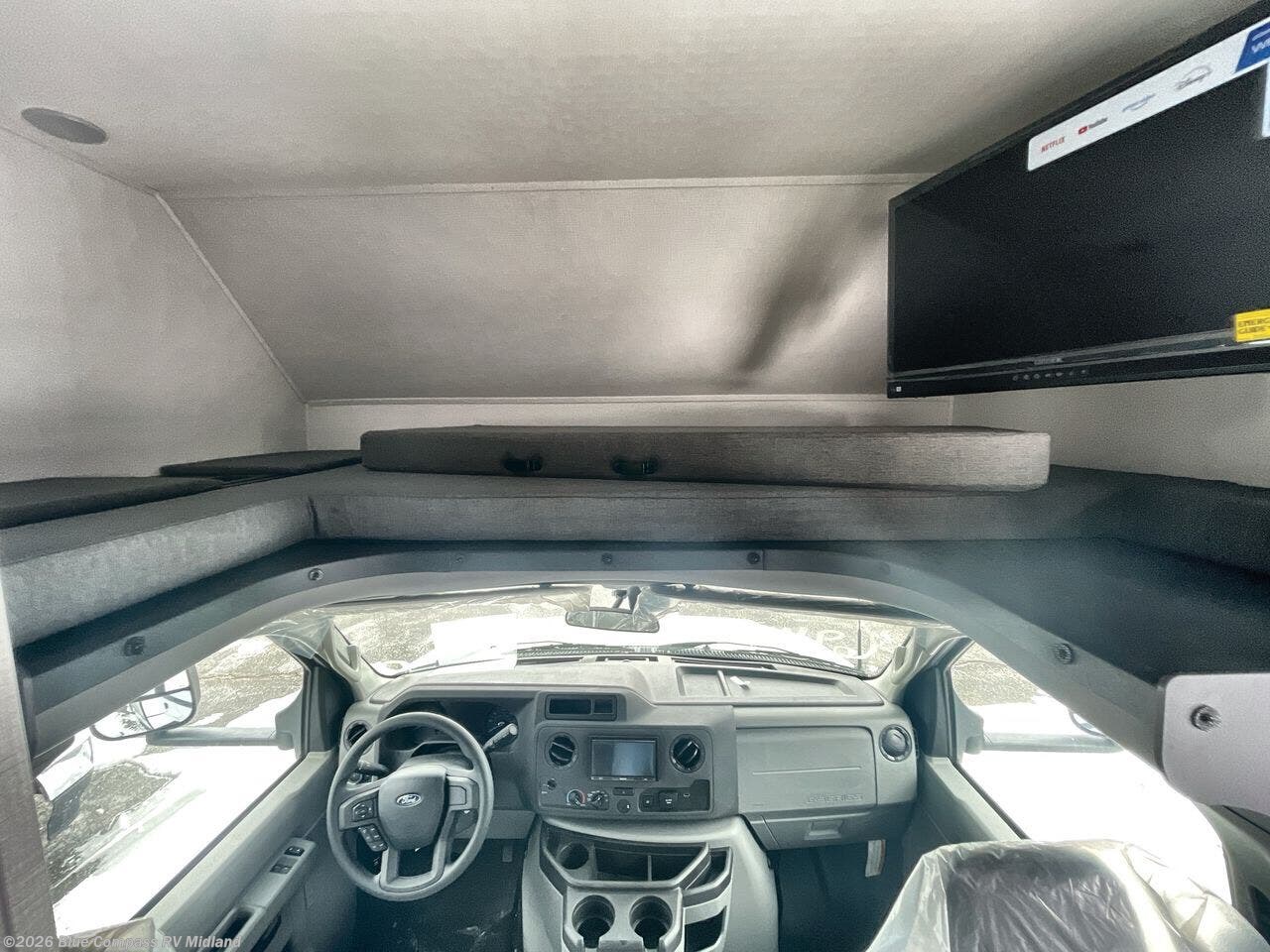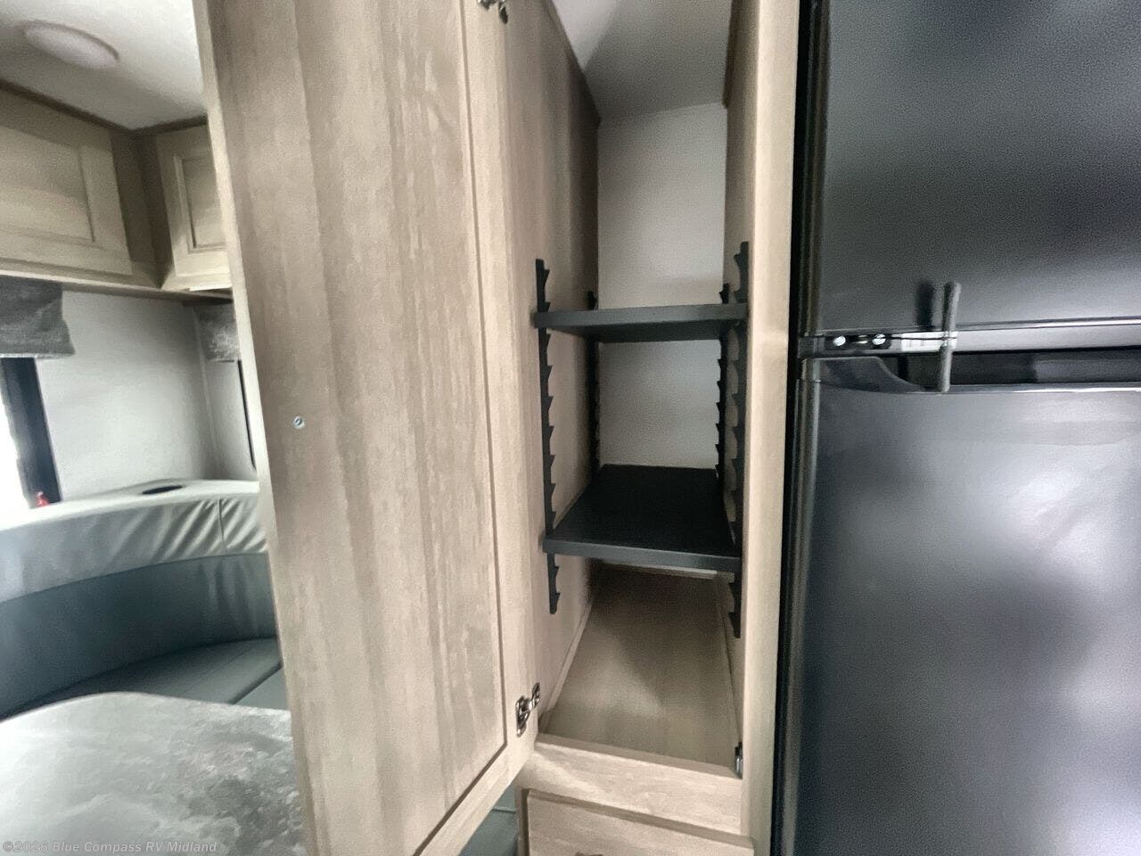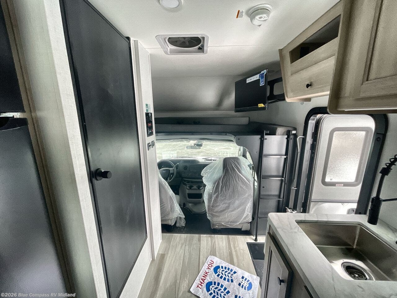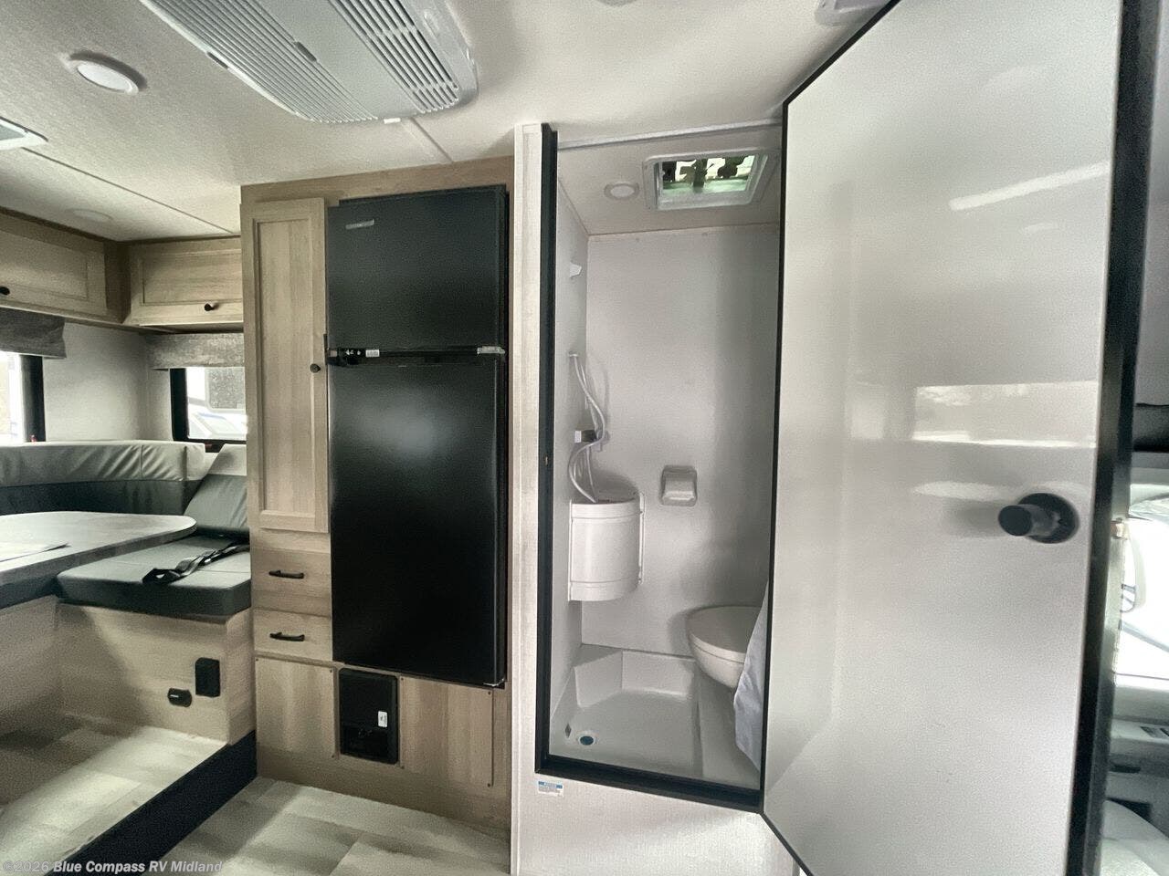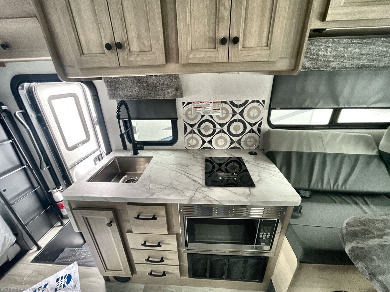 This motorhome is perfect for couples or small families. The bunk over the cab provides a cozy sleeping area, while the U-dinette offers additional sleeping space for guests or family members. The 12V TV is perfect for relaxing in the evenings or enjoying your favorite shows on the go. Plus, the wet bath is a practical and efficient space, making it easy to get ready in the morning or freshen up after a long day. Further, the kitchen is equipped with a 12V fridge, convection microwave/air fryer, and flip-up countertop, providing ample space to prepare meals and snacks. The pantry offers additional storage for your food and cooking essentials. Additionally, overhead cabinets throughout the unit provide plenty of storage for your belongings.