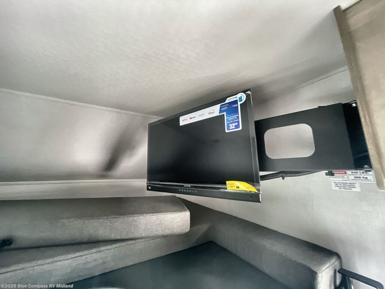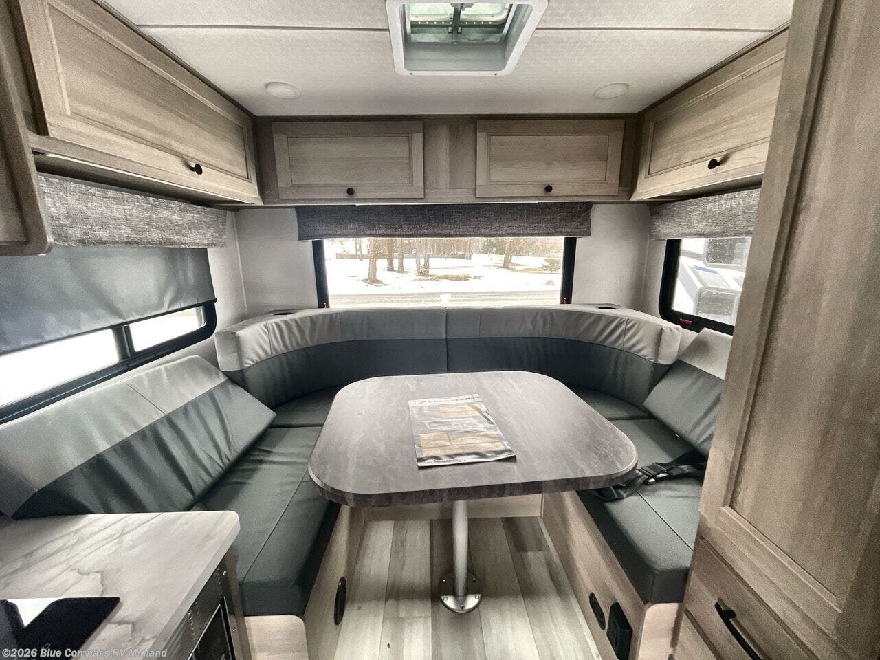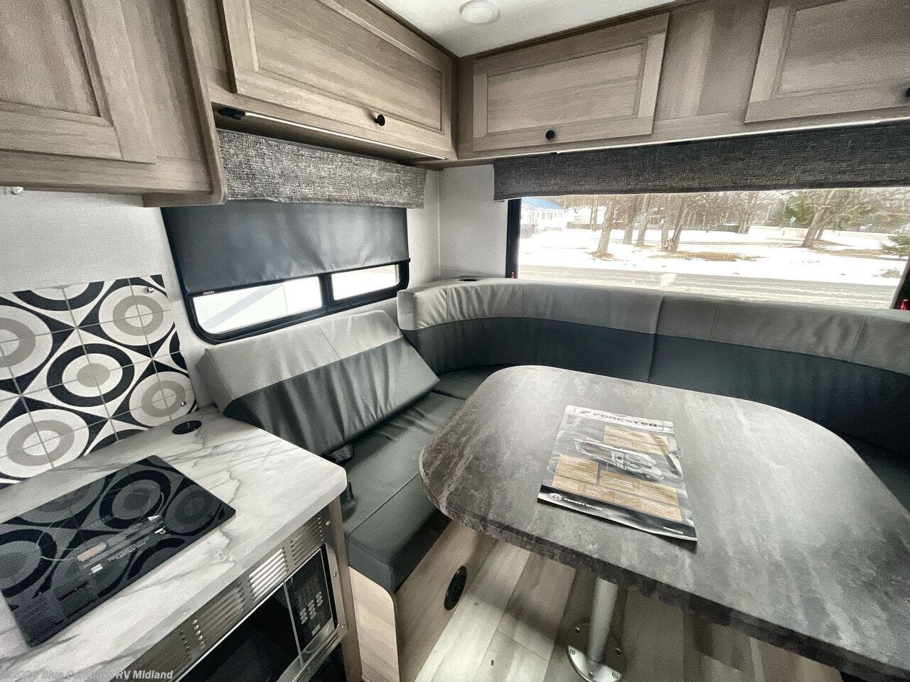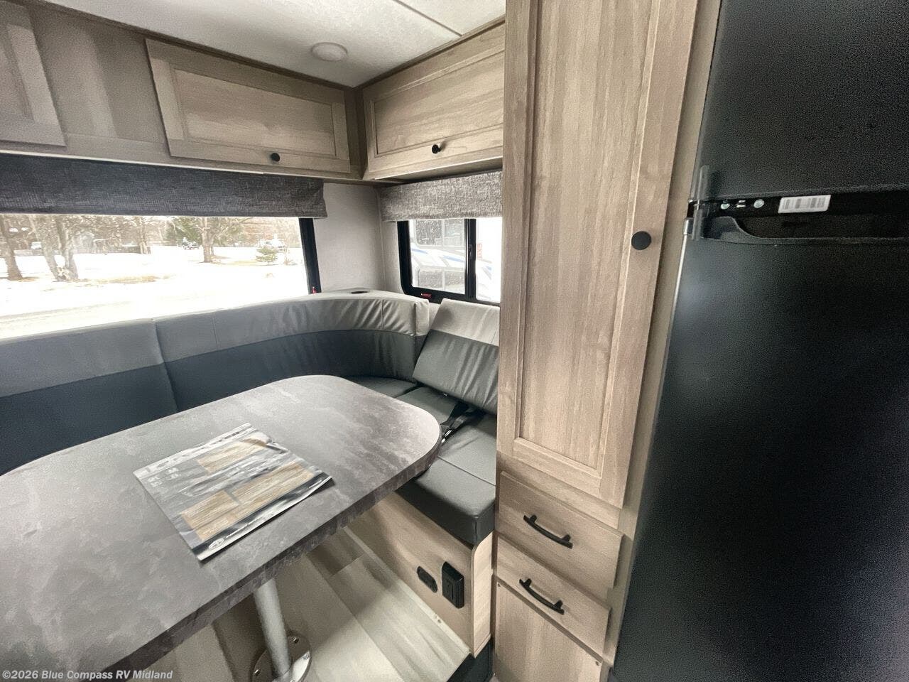 This motorhome is perfect for couples or small families. The bunk over the cab provides a cozy sleeping area, while the U-dinette offers additional sleeping space for guests or family members. The 12V TV is perfect for relaxing in the evenings or enjoying your favorite shows on the go. Plus, the wet bath is a practical and efficient space, making it easy to get ready in the morning or freshen up after a long day. Further, the kitchen is equipped with a 12V fridge, convection microwave/air fryer, and flip-up countertop, providing ample space to prepare meals and snacks. The pantry offers additional storage for your food and cooking essentials. Additionally, overhead cabinets throughout the unit provide plenty of storage for your belongings.