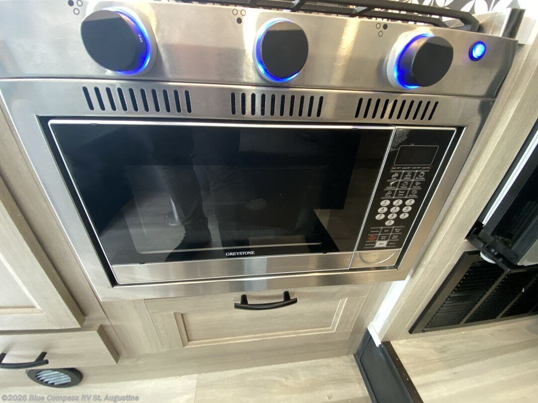Travel in style with your own accommodations in this coach. You'll find a queen-size cab-over bunk that can be utilized as extra sleeping space or even storage, plus the rear corner offers a queen bed. And don't forget about the U-dinette as extra sleeping space after dining, playing games and relaxing. The kitchen offers a 10.7 cu. ft. 12V refrigerator, a convection microwave, a recessed three-burner range, soft touch self-closing drawer guides and a cordless 12V charging plate. The private toilet and shower room gives you a place to get cleaned up, and the bathroom sink is just outside the door allowing someone else the ability to get ready at the same time.