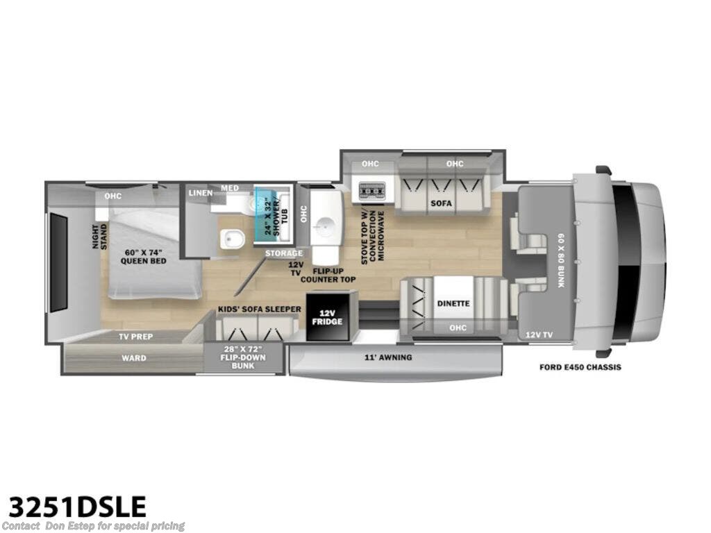 The Forester 3251SLE has a dedicated Kid Zone (fold down bunk, sofa sleeper, and entertainment center), private rear queen bedroom, and bunk over cab. The kitchen offers a convection microwave and recessed three-burner range. The refrigerator has plenty of room, and the U-shaped dinette is perfect for family dining. The bathroom has a 24" x 32" skylight shower, commode, sink, and medicine cabinet, plus storage cabinets just outside the door. This model is built on a Ford E450 chassis.
