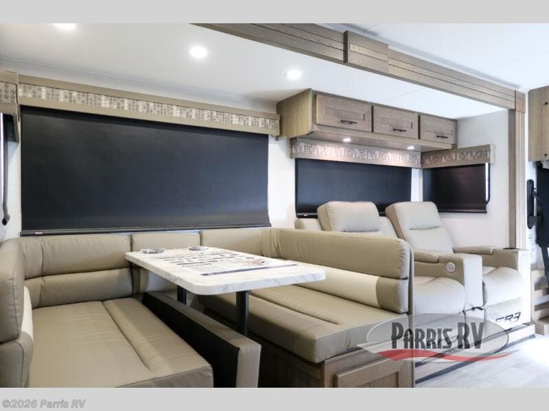 Whether you travel with your spouse, grandkids or friends, this FR3 Class A gas motorhome allows you to travel in style with plenty of additional sleeping choices from the power overhead bunk to the furniture once they are set up at night. You can dine at the wrap-around booth dinette, relax on the hide-a-bed sofa, and make full meals in the kitchen which also includes a residential microwave and countertop extension. The separated bathroom allows someone to take a shower while another freshens up with the private sink and toilet, or maybe you decide to close this area off within the bedroom. Every night you can sleep like a king while watching the 32" LED 12V TV in the bedroom, and maybe you decided to add the washer/dryer option to keep everything clean while on the road.