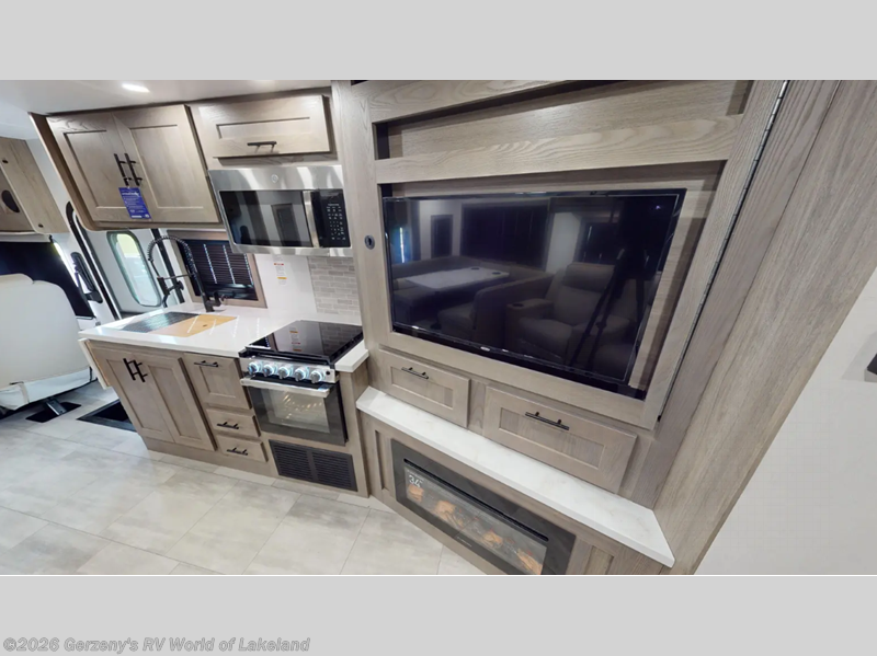 It won't be hard to find comfort in this spacious coach for five to six! Once you arrive at the campground, you can put out the 19' power awning with an LED light and turn on the outdoor TV. Once you've unloaded the pass-through storage, you can head inside to relax on the 68" theater seating or play a game at the wrap-around booth dinette. There is also a 40" Smart TV with a hidden pantry behind it and a fireplace for those cooler evenings. The chef will find everything they need to prepare meals each day, including a residential microwave, a stainless steel three burner cooktop with a 22" oven, and a stainless steel 15 cu. ft. 12V refrigerator for food storage. You can retreat to the rear private bedroom when you're ready to call it a night. Here, you'll enjoy a king bed slide out with dual nightstands and 110V/USB ports, dual bedroom wardrobes, and a 32" 12V TV. This model also includes a convenient full bath and a stackable washer and dryer prep if you choose to add those appliances!
