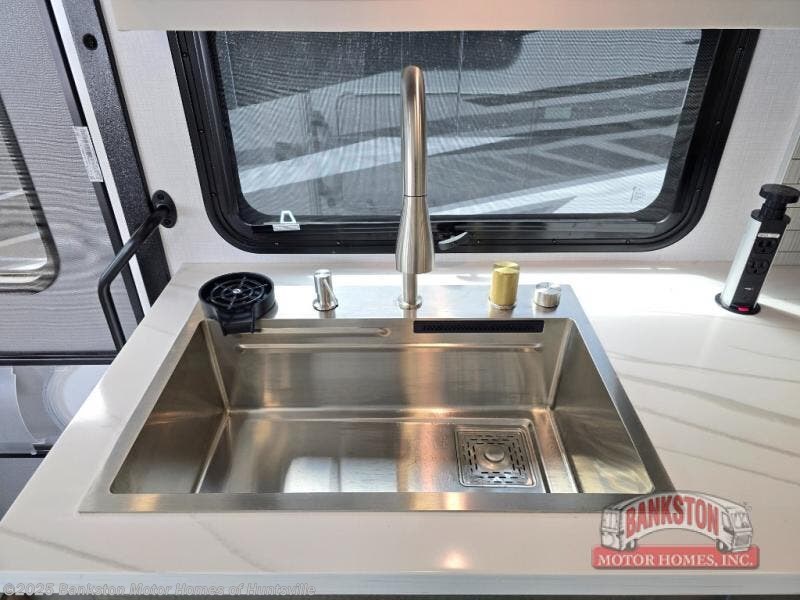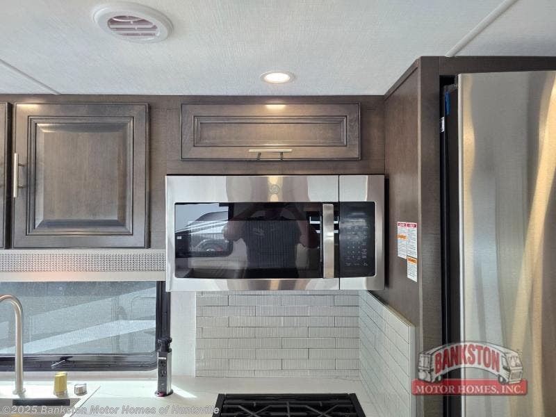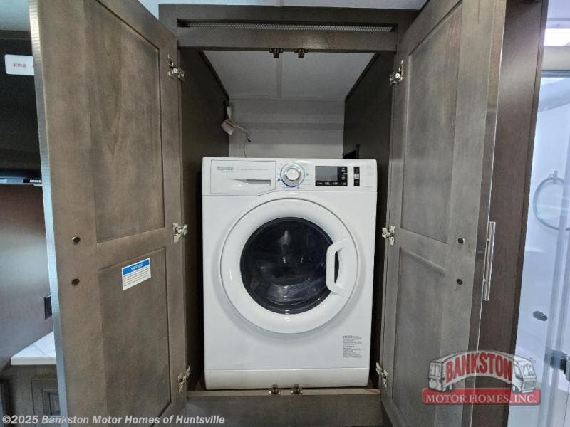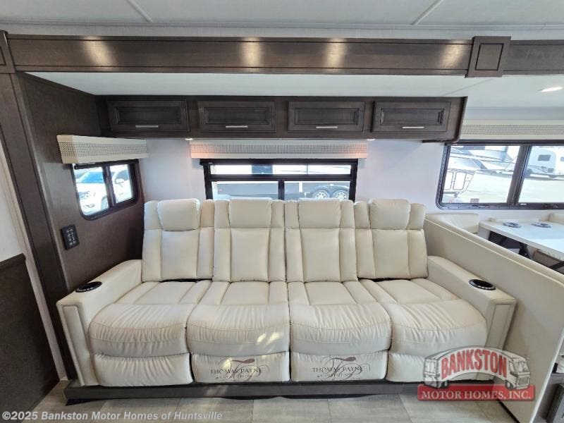 You will love the spacious living entertainment in this motorhome! There is a Thomas Payne 4-person theater seating that reclines with adjustable headrests, heat, massage and has pop-up 110V outlets. There is also a 5,000 BTU fireplace with a 40" LED TV to watch your favorite movies in true comfort. The kitchen has everything you need to prepare your best home cooked meals including a brush nickel designer faucet with a pull out spray wand for easy clean up, and you can enjoy all of your meals at the Dream Dinette. You will appreciate having your own private retreat with the rear bedroom which has a 72" x 80" king bed slide across from a dresser with a 32" LED TV, a wardrobe on one side, and another wardrobe on the other with an optional combo washer and dryer. There is also a power front overhead bunk for more sleeping space!