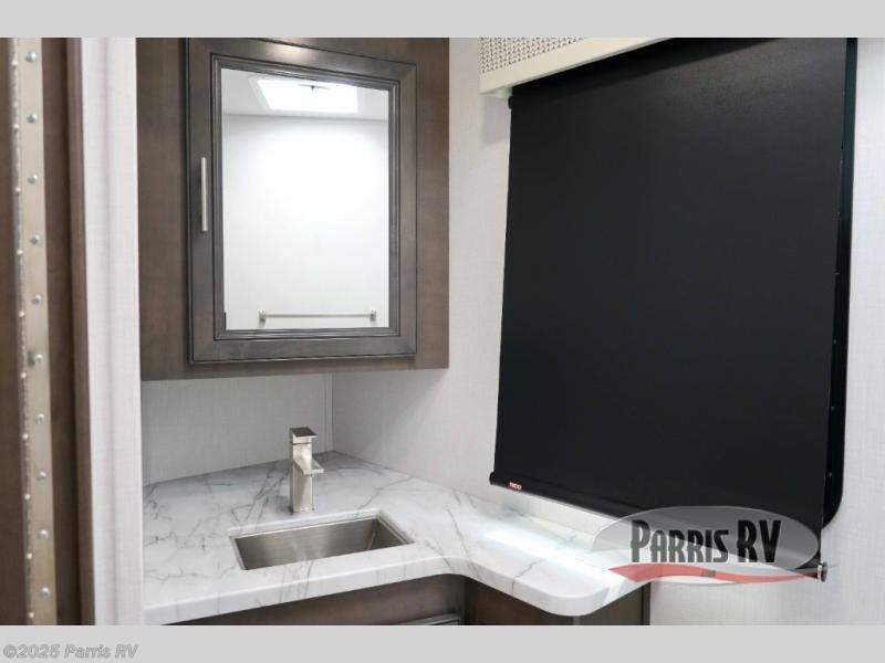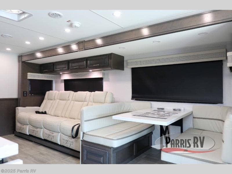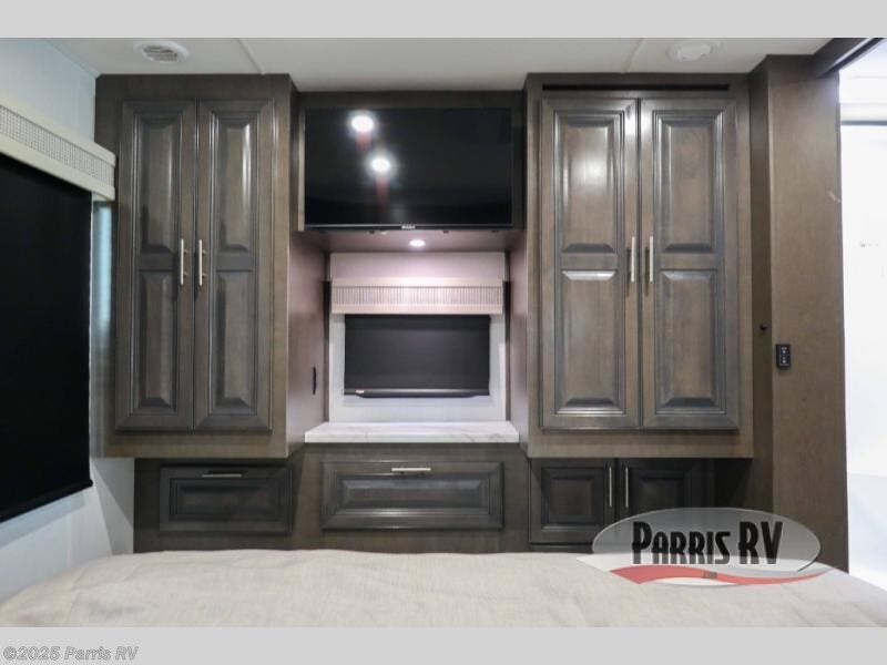 You will love the spacious living entertainment in this motorhome! There is a Thomas Payne 4-person theater seating that reclines with adjustable headrests, heat, massage and has USB outlets. There is also a 5,000 BTU fireplace with a 40" LED TV to watch your favorite movies in true comfort. The kitchen has everything you need to prepare your best home cooked meals including a brush nickel designer faucet with a pull-out spray wand for easy clean up, and you can enjoy all of your meals at the Dream Dinette. You will appreciate having your own private retreat with the rear bedroom which has a 72" x 80" king bed slide across from a dresser with a 32" LED TV, a wardrobe on one side, and another wardrobe on the other with an optional combo washer and dryer. There is also a power front overhead bunk for more sleeping space!