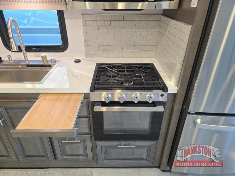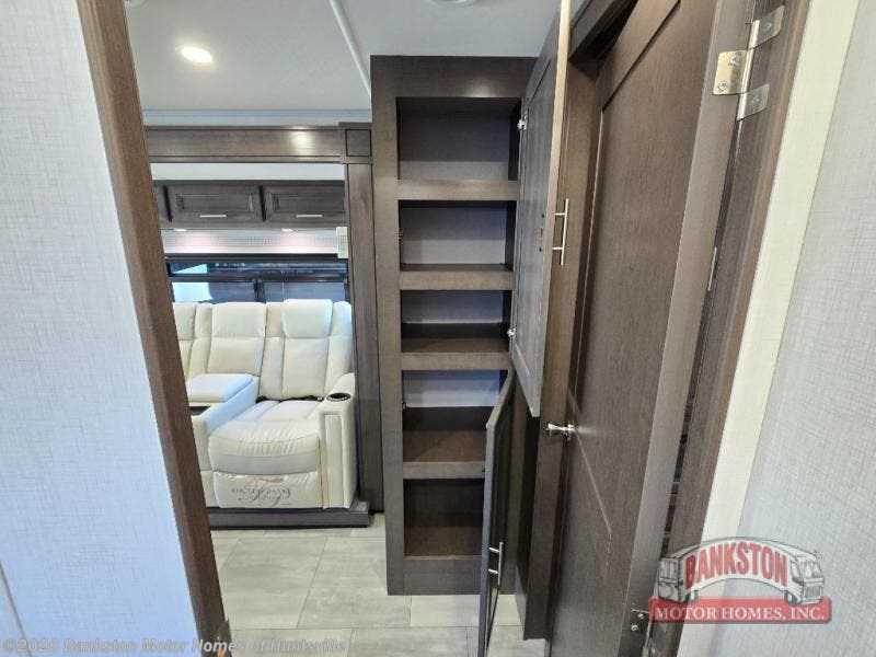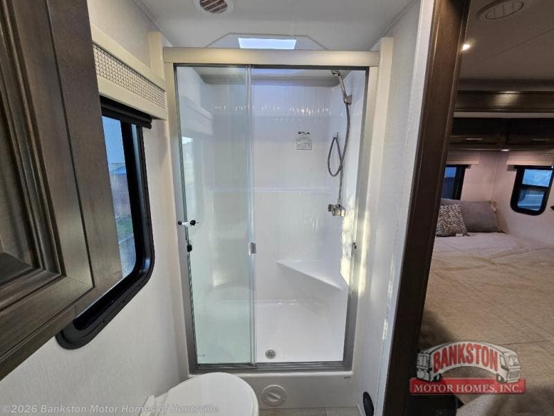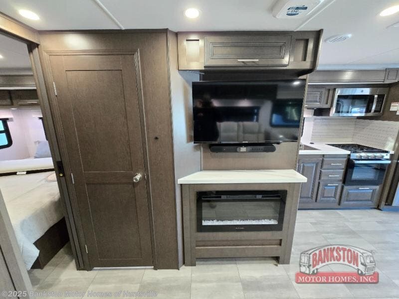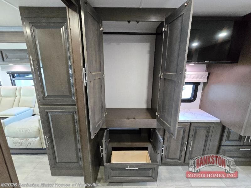 Three slides help to open up this motorhome! The kitchen slide features all of your essentials for cooking delicious meals and you even have a hutch with overhead cabinets to store all of your dishes. The Dream Dinette and Thomas Payne theater seating slide not only open up the living area but also provide comfortable places to eat meals and unwind in front of the 5,000 BTU fireplace and 40" LED TV after a long day of traveling. The half bathroom is close to the kitchen and living area, so you don't have to go far for a quick bathroom break. The master suite will have you feeling right at home with a 72" x 80" king bed slide to lay your head on at night with a dresser across from it that also has a 32" LED TV and wardrobes on either side of it with one of them with an optional washer and dryer. Plus, you even have access to the full rear bathroom which has a shower with a seat to freshen up in each morning!