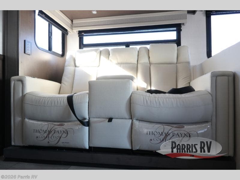 You won't believe all that the rear private bedroom has to offer in this motorhome! It features a 72" x 80" king bed slide with overhead cabinets, a dresser with a 32" TV and overhead cabinets, wardrobes on either side of the dresser, and a desk with wardrobes on either. And one of the wardrobes features an optional stacked washer and dryer for convenience! The split-style bathroom makes it easy for one person to freshen up in the shower with a seat while another uses the private toilet and sink. After a long day of traveling, you can relax on either the Thomas Payne theater seating with heat and massage across from the 5,000 BTU fireplace with a 40" LED TV above it or play a game and eat a meal at the Dream Dinette. There is also a power front overhead bunk for more sleeping space!