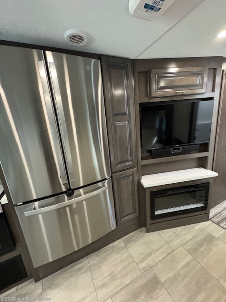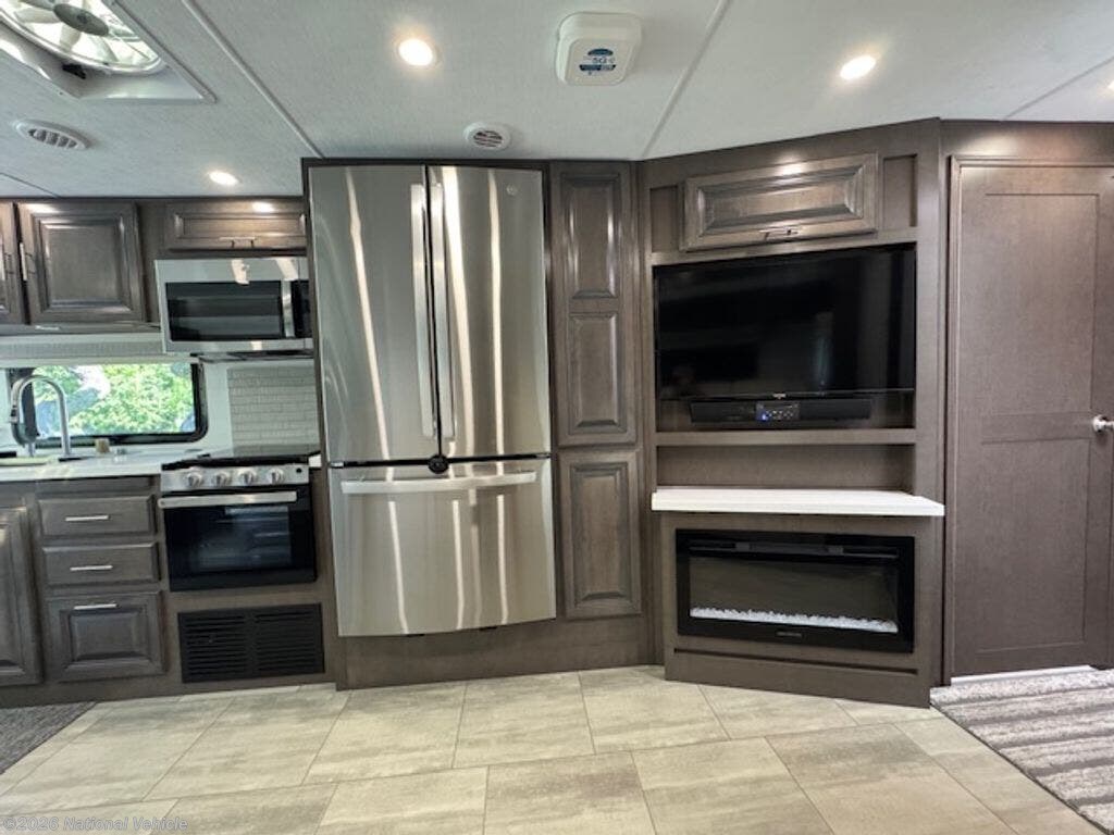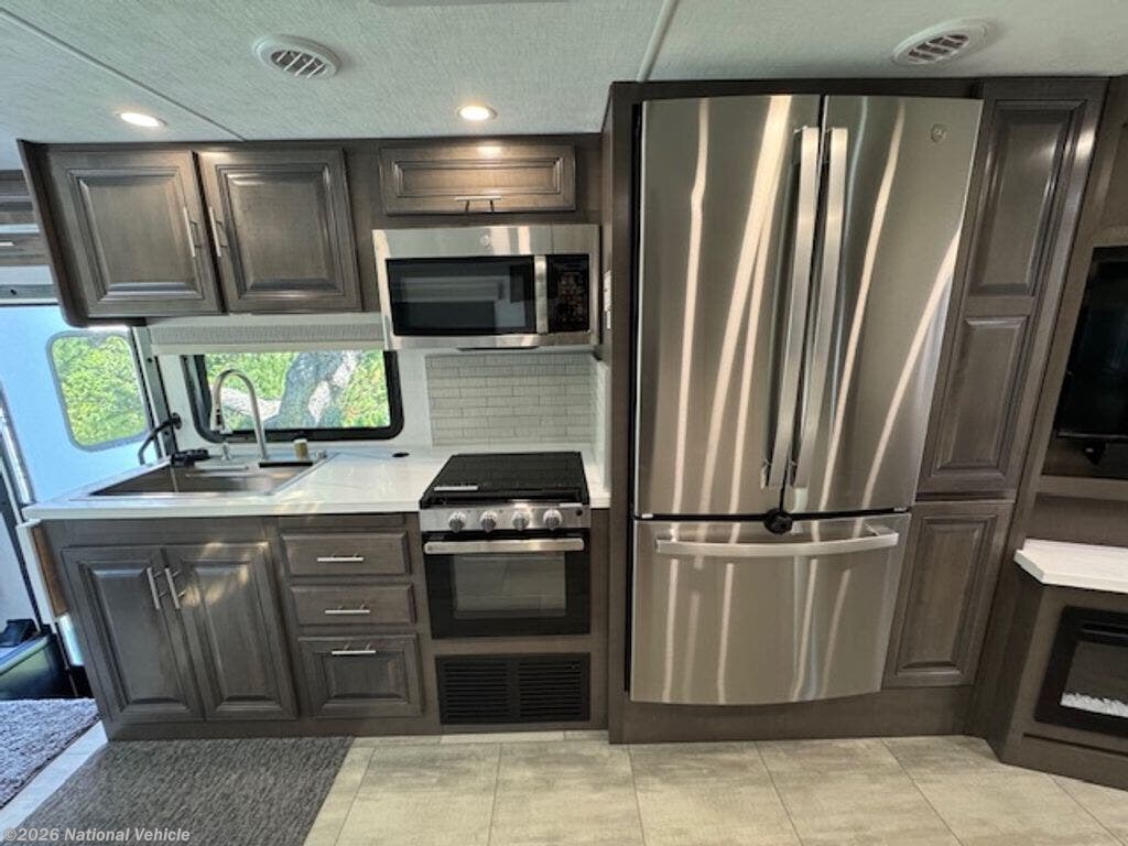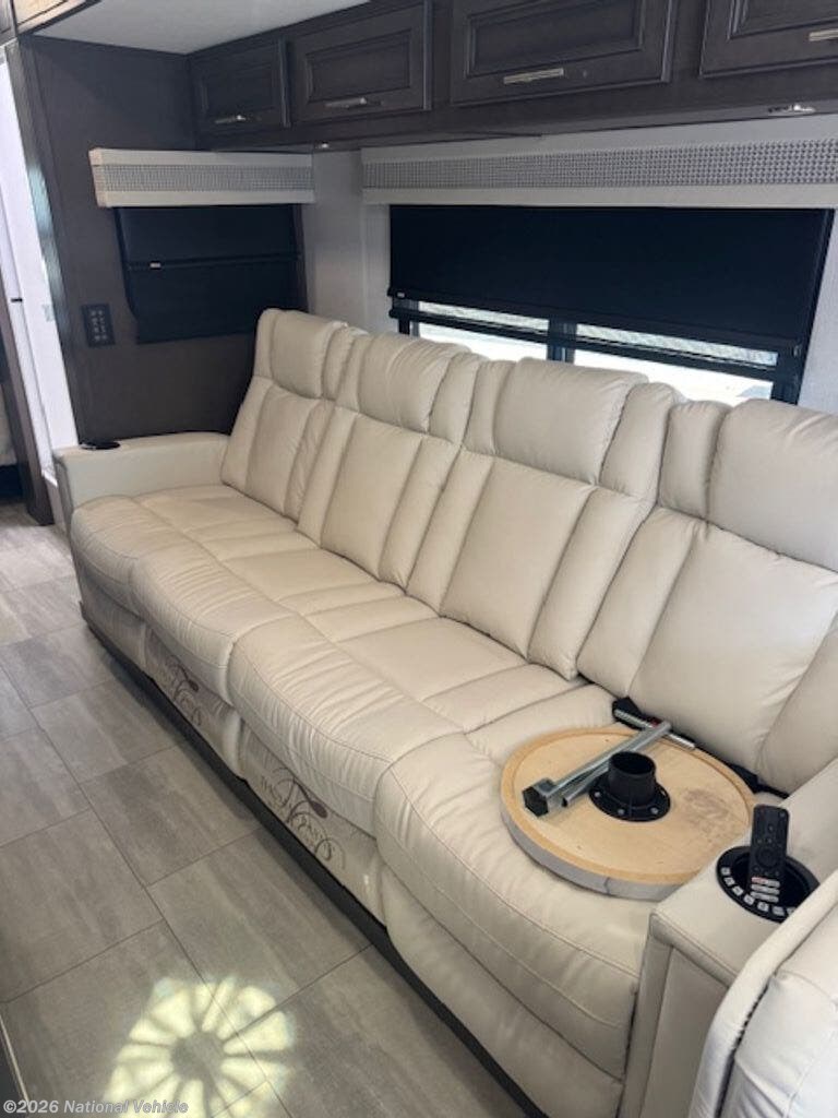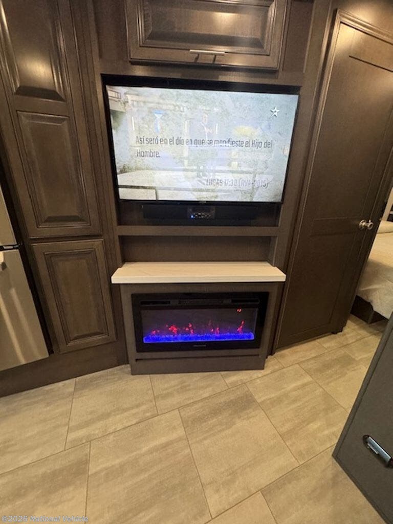 Inside, enjoy premium comforts including a plush theater seating area with heat and massage, a cozy fireplace, and a large entertainment center?perfect for relaxing after a day on the road. The fully equipped kitchen features solid surface countertops, stainless steel appliances, and an oversized residential refrigerator, while the private rear bedroom offers a king bed and ample storage for a true home-away-from-home experience.