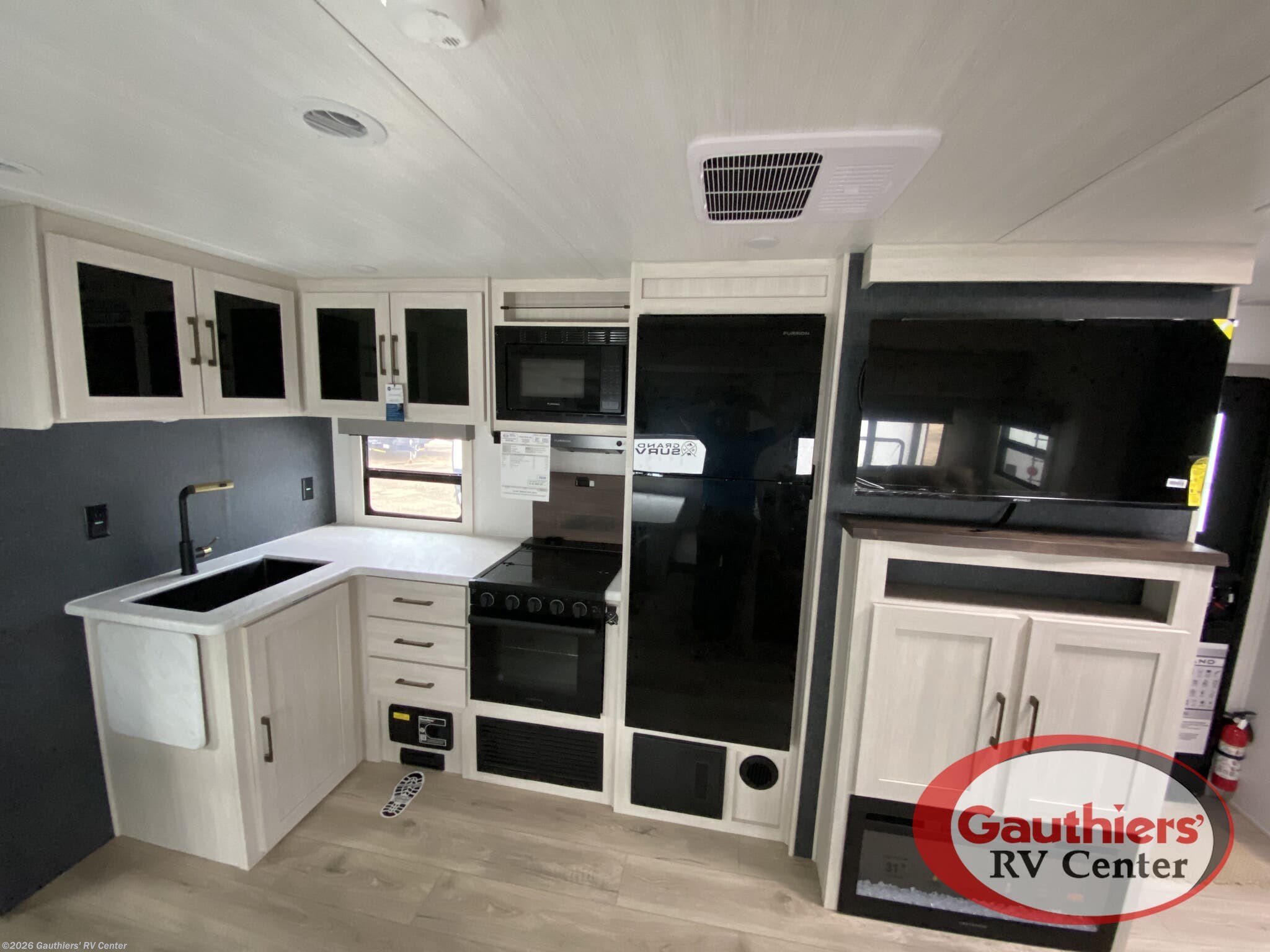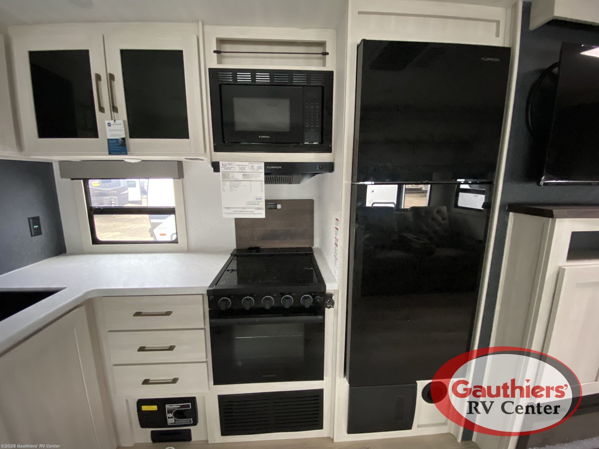 - Modern amenities: Microwave, oven, stovetop, 12V refrigerator, and a central vacuum for easy cleanup