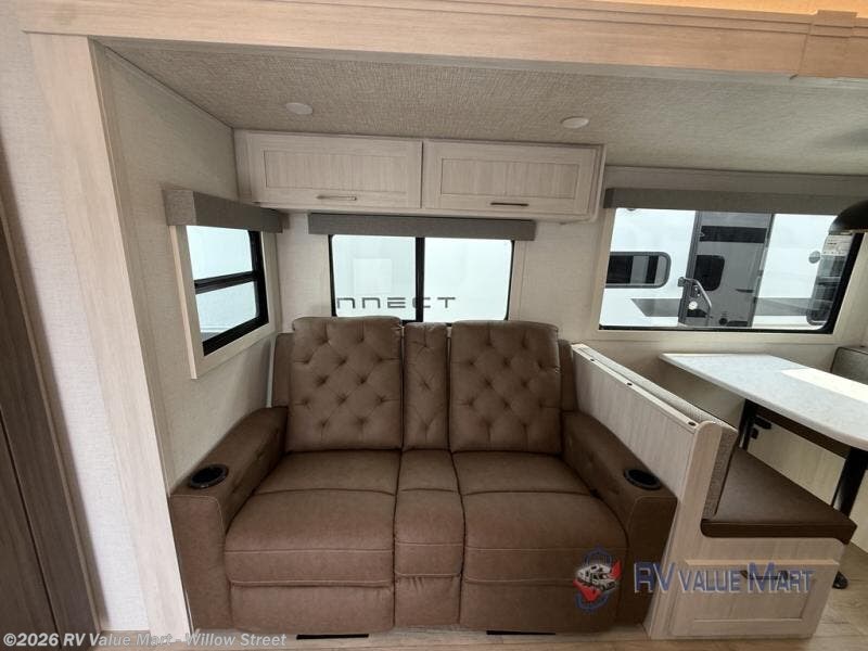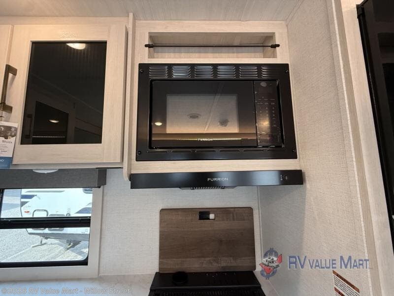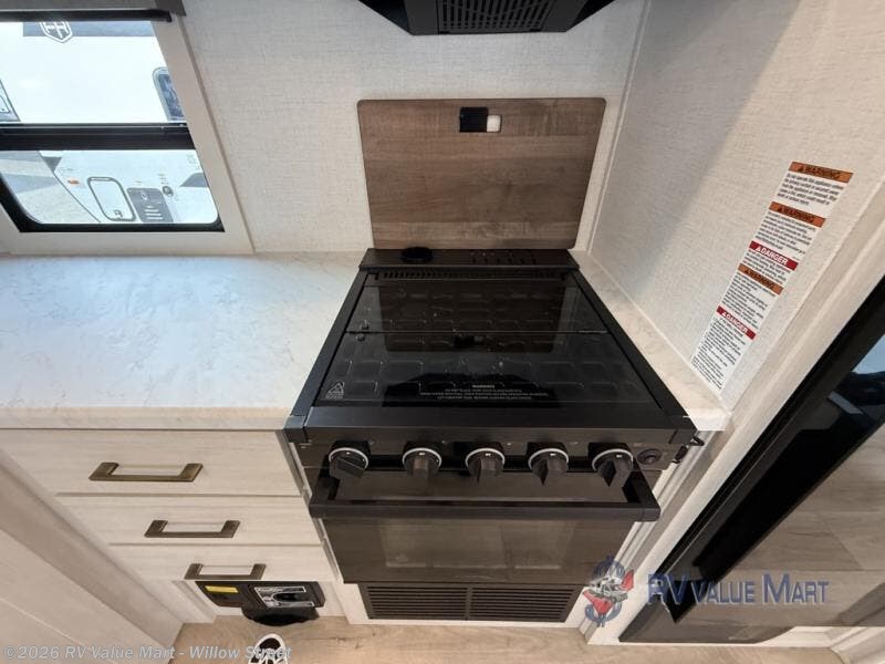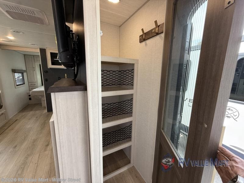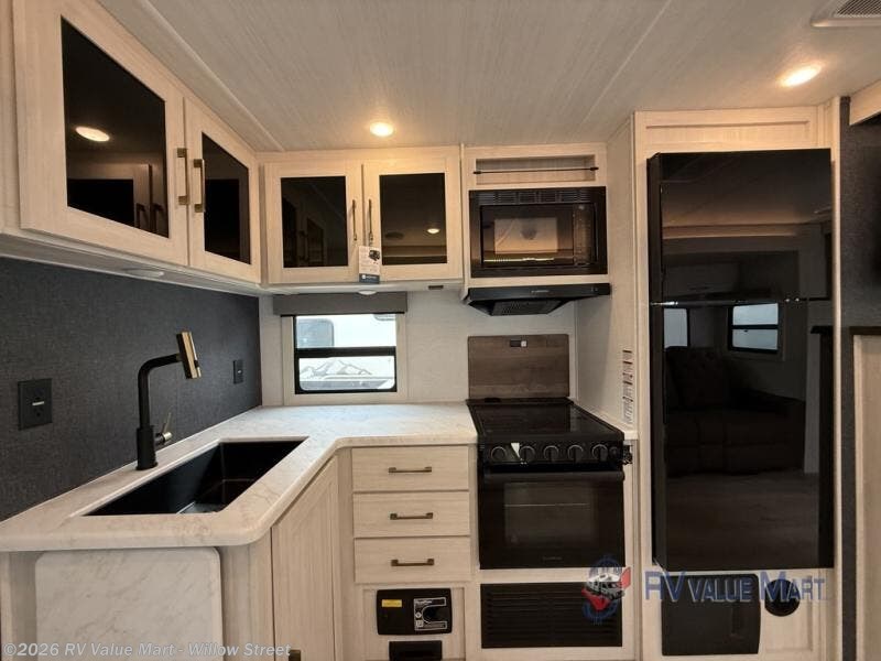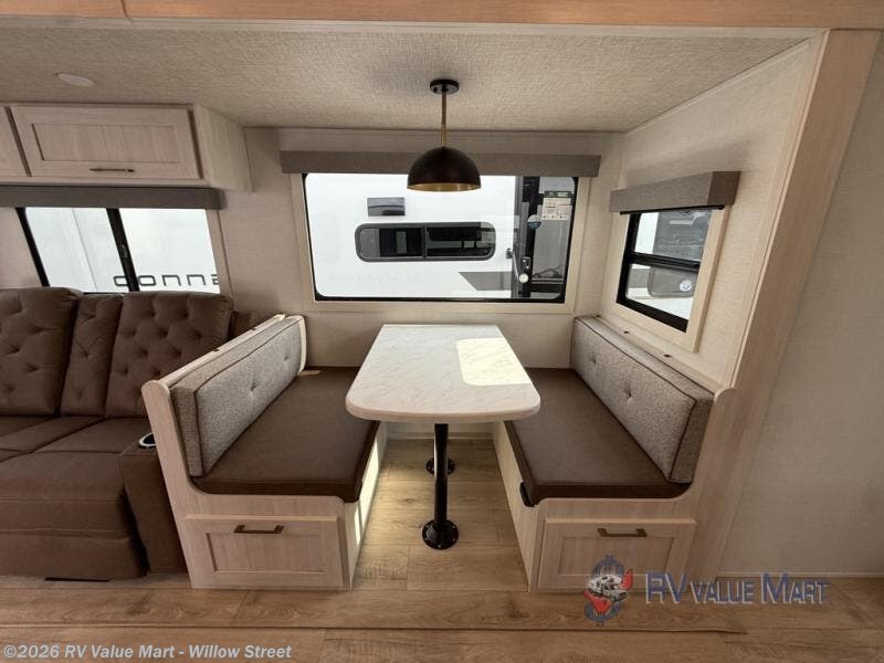 No need to rough it when you camp; this trailer offers amenities that allow you to "Glamp" if you want! The rear spacious bathroom is tucked away behind a beautiful barn door, and inside features a shower, wardrobe, and linen storage. The front master bedroom offers privacy, a walk-around custom king bed, dual wardrobes and underbed storage, plus TV prep if you want the option to watch movies in bed. The L-shaped counter in the kitchen provides enough space to have everything at your fingertips while you cook, plus there is a countertop extension for more prep and serving space if needed. A nice walk-in pantry just inside the entry door will be perfect for chips and snacks or canned goods for those longer camping trips. If dining inside, the booth dinette with pull-out dinette drawers will be comfortable plus you will enjoy the view provided by the panoramic windows within the slide out. An outside kitchen will be a favorite for anyone that cooks, and the 19' awning will provide some protection from the elements and offering an outdoor living area to enjoy with everyone.