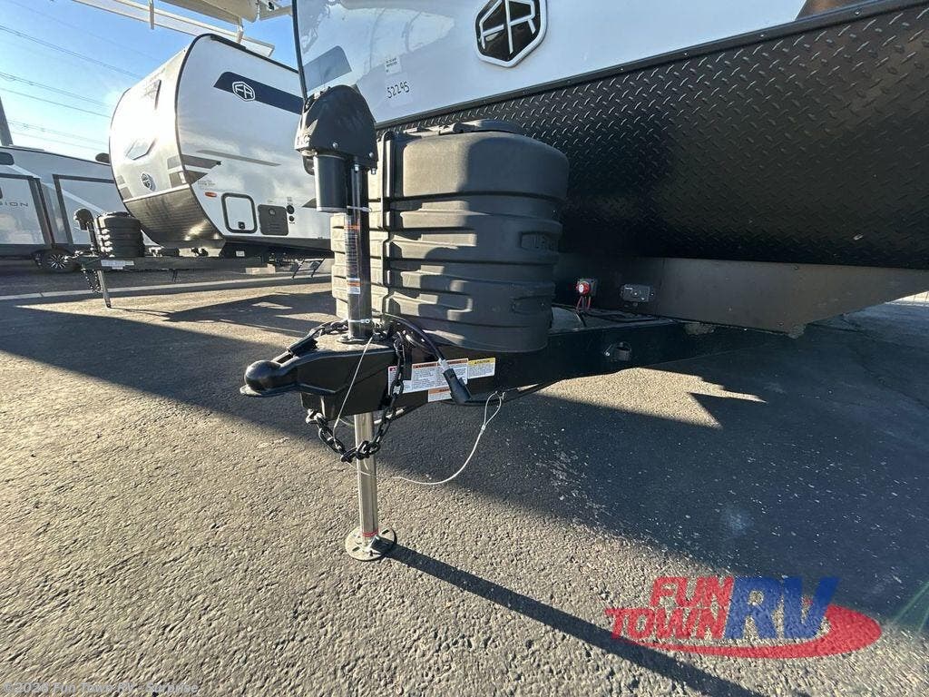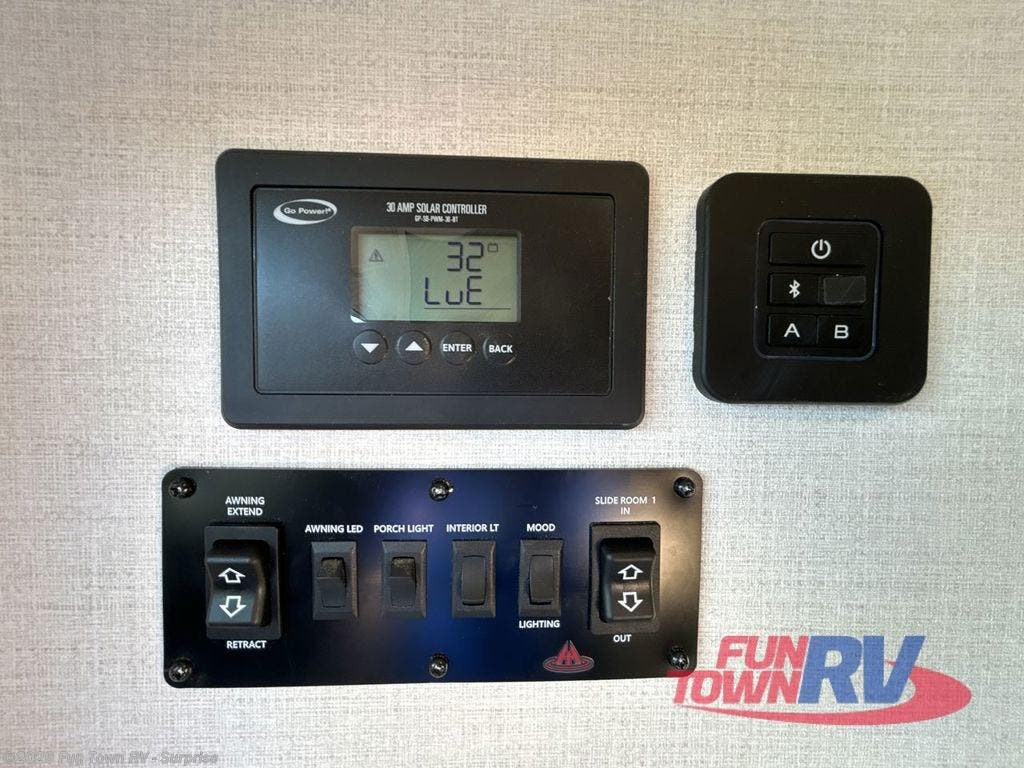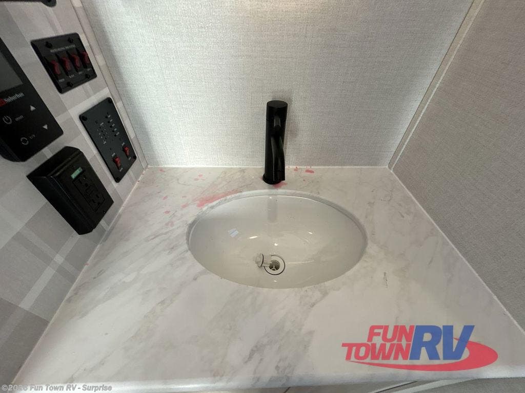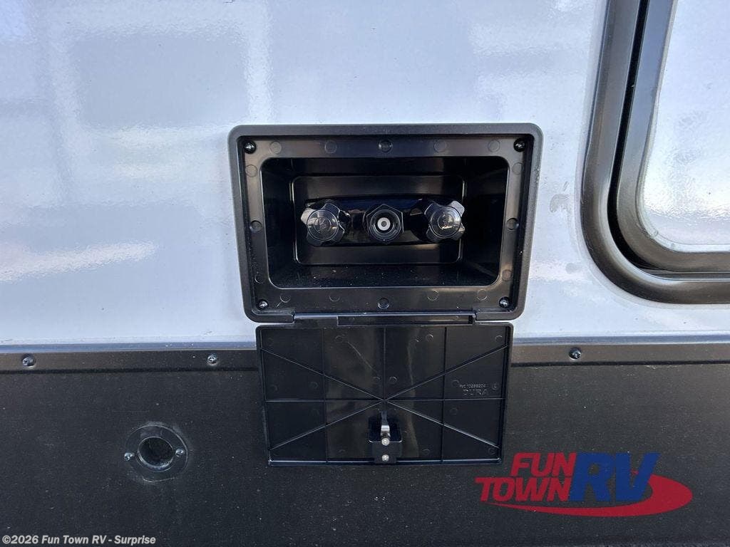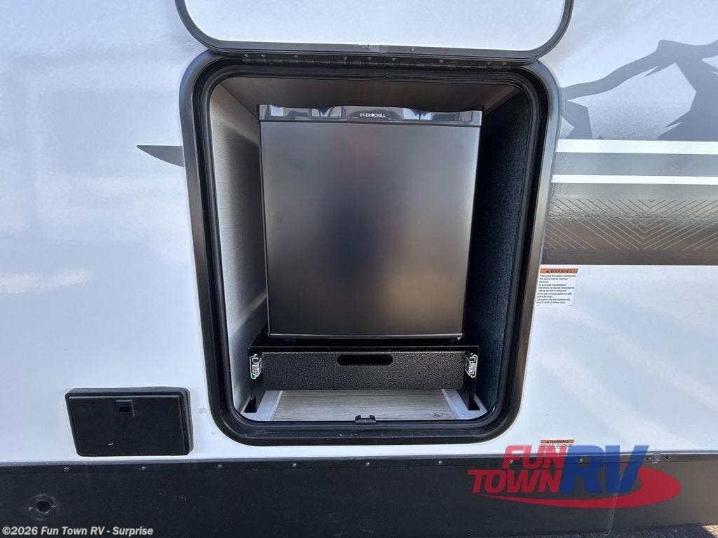 No need to rough it when you camp; this trailer offers amenities that allow you to "Glamp" if you want! The rear spacious bathroom is tucked away behind a beautiful barn door, and inside features a shower, wardrobe, and linen storage. The front master bedroom offers privacy, a walk-around custom king bed, dual wardrobes and underbed storage, plus TV prep if you want the option to watch movies in bed. The L-shaped counter in the kitchen provides enough space to have everything at your fingertips while you cook, plus there is a countertop extension for more prep and serving space if needed. A nice walk-in pantry just inside the entry door will be perfect for chips and snacks or canned goods for those longer camping trips. If dining inside, the booth dinette with pull-out dinette drawers will be comfortable plus you will enjoy the view provided by the panoramic windows within the slide out. An outside kitchen will be a favorite for anyone that cooks, and the 19' awning will provide some protection from the elements and offering an outdoor living area to enjoy with everyone.