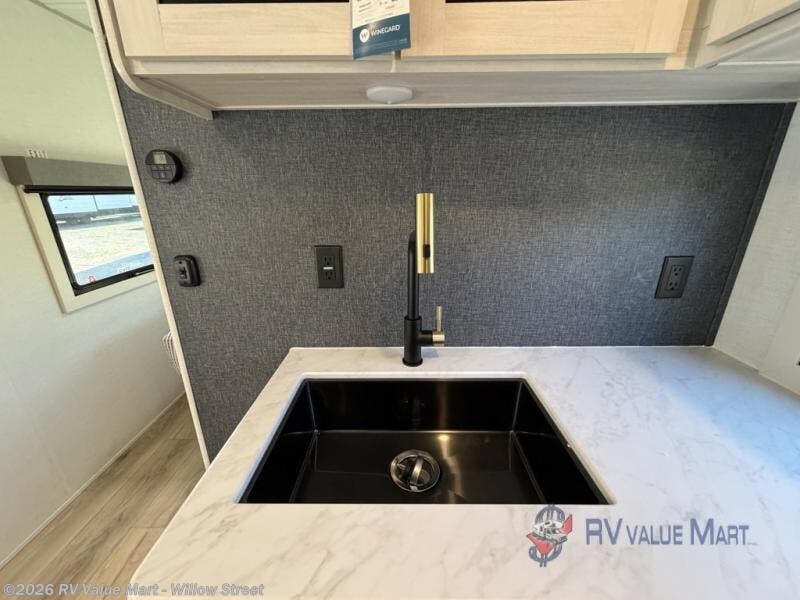 No need to rough it when you camp; this trailer offers amenities that allow you to "Glamp" if you want! The rear spacious bathroom is tucked away behind a beautiful barn door, and inside features a shower, wardrobe, and linen storage. The front master bedroom offers privacy, a walk-around custom king bed, dual wardrobes and underbed storage, plus TV prep if you want the option to watch movies in bed. The L-shaped counter in the kitchen provides enough space to have everything at your fingertips while you cook, plus there is a countertop extension for more prep and serving space if needed. A nice walk-in pantry just inside the entry door will be perfect for chips and snacks or canned goods for those longer camping trips. If dining inside, the booth dinette with pull-out dinette drawers will be comfortable plus you will enjoy the view provided by the panoramic windows within the slide out. An outside kitchen will be a favorite for anyone that cooks, and the 19' awning will provide some protection and offering an outdoor living area to enjoy with everyone.