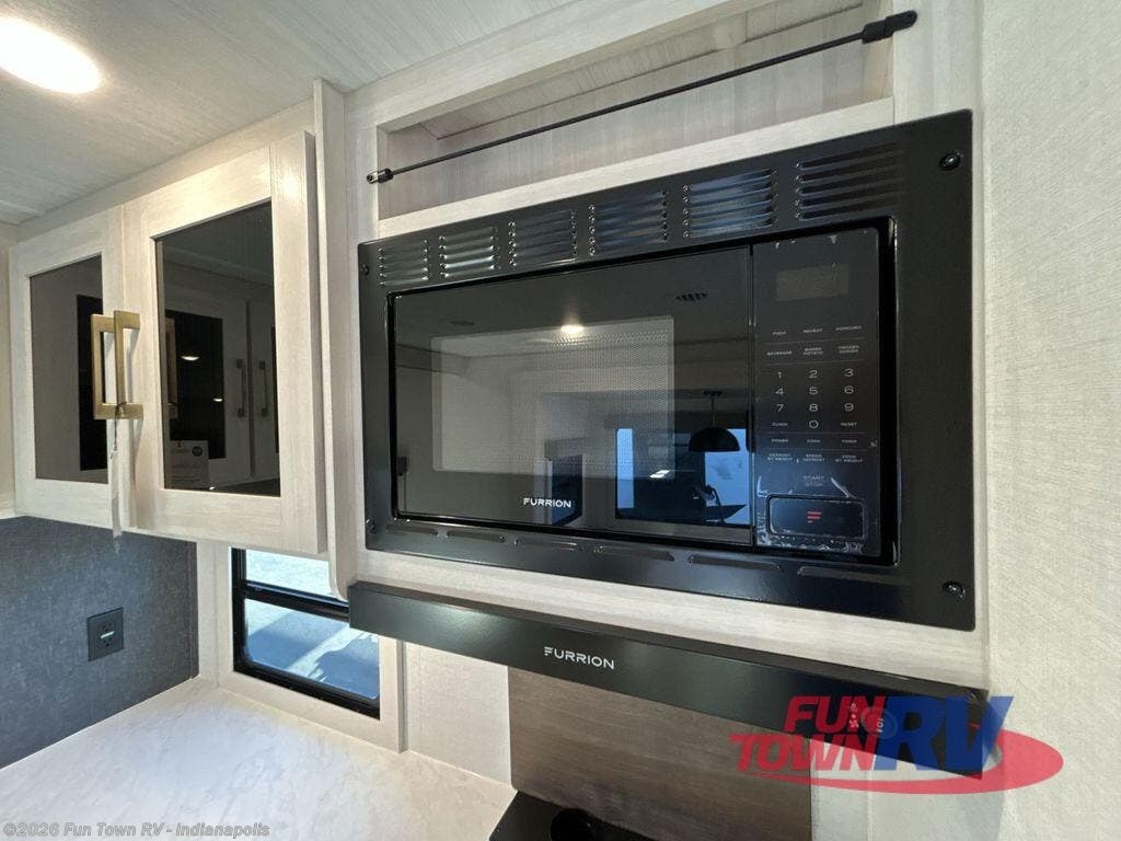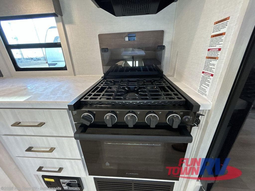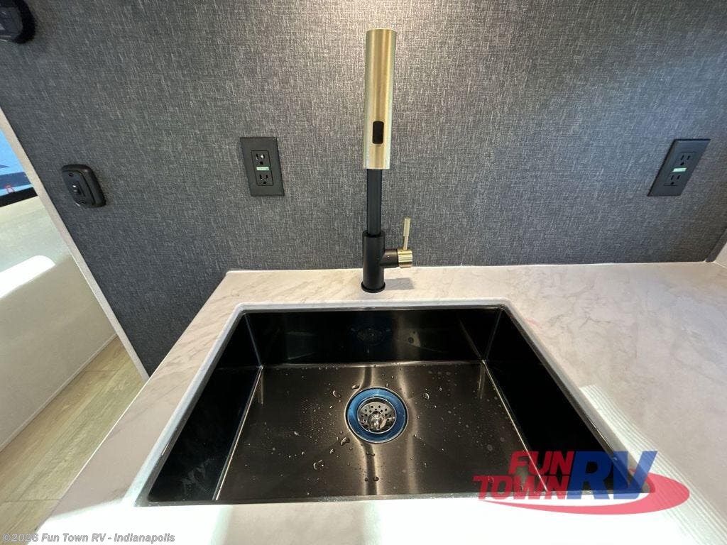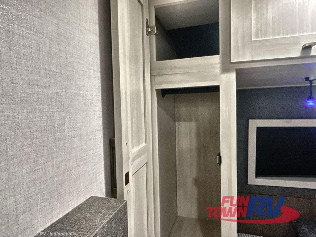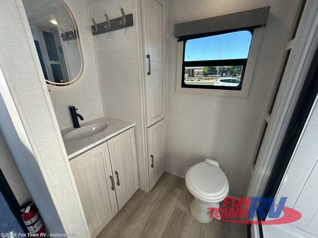 No need to rough it when you camp; this trailer offers amenities that allow you to "Glamp" if you want! The rear spacious bathroom is tucked away behind a beautiful barn door, and inside features a shower, wardrobe, and linen storage. The front master bedroom offers privacy, a walk-around custom king bed, dual wardrobes and underbed storage, plus TV prep if you want the option to watch movies in bed. The L-shaped counter in the kitchen provides enough space to have everything at your fingertips while you cook, plus there is a countertop extension for more prep and serving space if needed. A nice walk-in pantry just inside the entry door will be perfect for chips and snacks or canned goods for those longer camping trips. If dining inside, the booth dinette with pull-out dinette drawers will be comfortable plus you will enjoy the view provided by the panoramic windows within the slide out. An outside kitchen will be a favorite for anyone that cooks, and the 19' awning will provide some protection from the elements and offering an outdoor living area to enjoy with everyone.