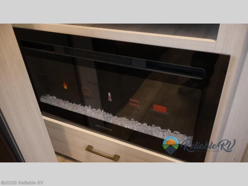 The perfect couples coach that is cozy and also features room for guests! As you enter you will notice the bar top with two chairs facing the rear of the unit where you can easily view the TV and fireplace in the living area while you enjoy your morning coffee. The combined kitchen and living area features two slides with the larger slide along the roadside featuring the kitchen appliances and an E-Z out sofa bed which would be great for overnight family and friends. There is also a theater seat facing the TV and fireplace, and a slide out free standing table with two chairs on one side and a multi-purpose ottoman than can be used where you need it anytime. Central vac will allow you to clean up easily throughout the unit. You also can choose to cook inside or out thanks to the outside kitchen featured under the 20' awning. When it's time to call it a night, you can clean up in the spacious full bath, then head to the front master bedroom to retire. There is a custom king bed slide out here, along with a full-wall wardrobe in front, a dresser and desk, a closet with washer and dryer prep, plus a second fireplace!