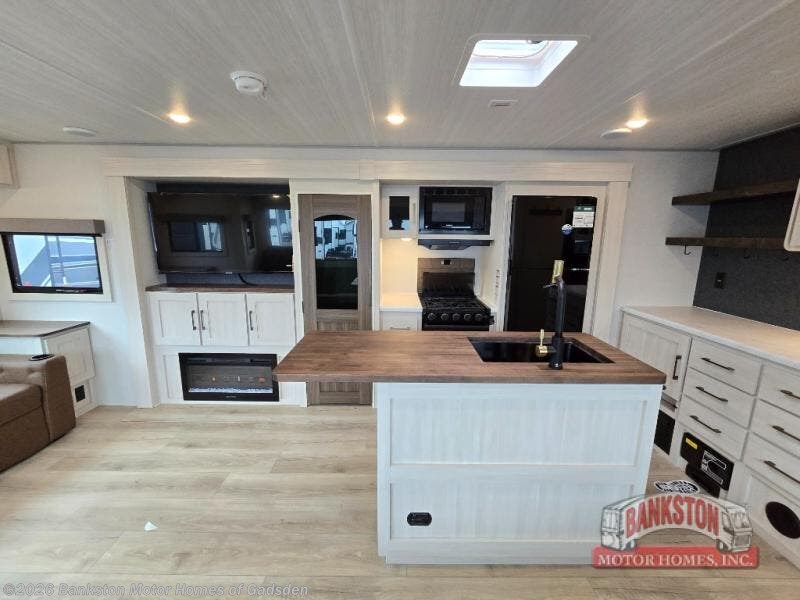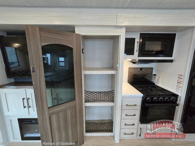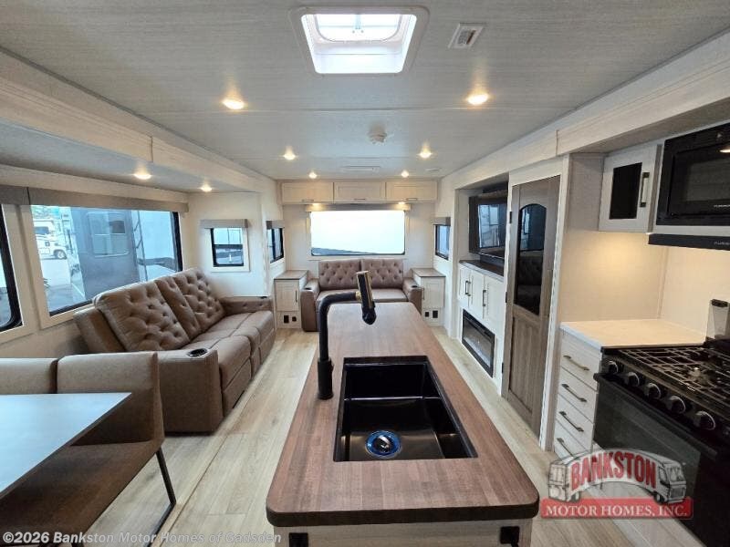 If luxury is what you're looking for, you won't have to search far with this travel trailer! There are triple slides, with dual opposing slides in the main living area for maximum space. The kitchen island gives a more residential feel to this space, plus there is a pantry, a hutch with shelves, a 10 cu. ft. 12V black glass refrigerator, and more kitchen features you are sure to love. The rear living area includes a tri-fold sofa to provide sleeping space for two overnight guests, and there is a theater seat across from the fireplace and HD TV. You'll also enjoy dining at the free-standing dinette with a multi-purpose ottoman! When it's time to call it a night, you can clean up in the spacious full bath, then head to the front master bedroom to retire. There is a custom king bed slide out here, along with a full-wall wardrobe in front, a dresser, a closet with washer and dryer prep, plus a bedroom fireplace!