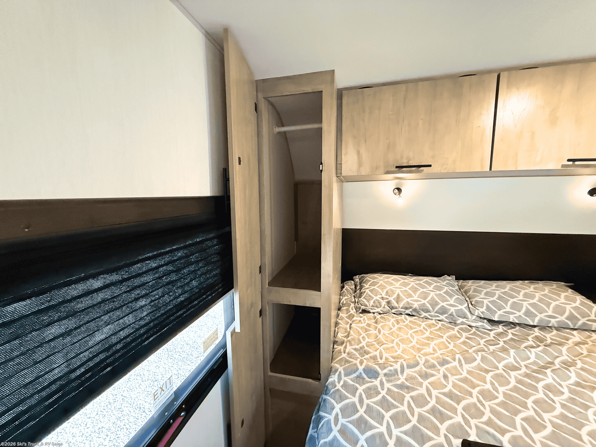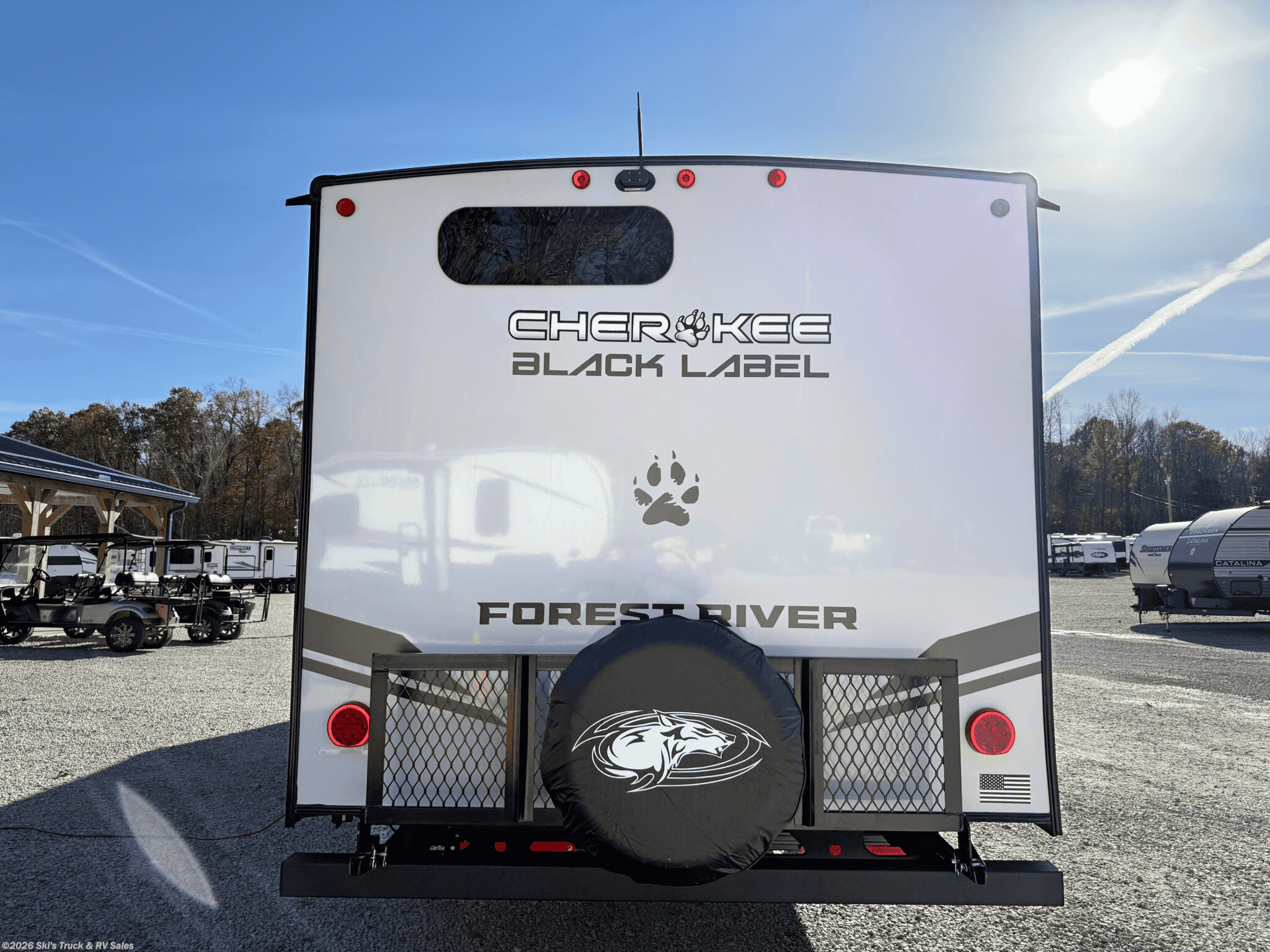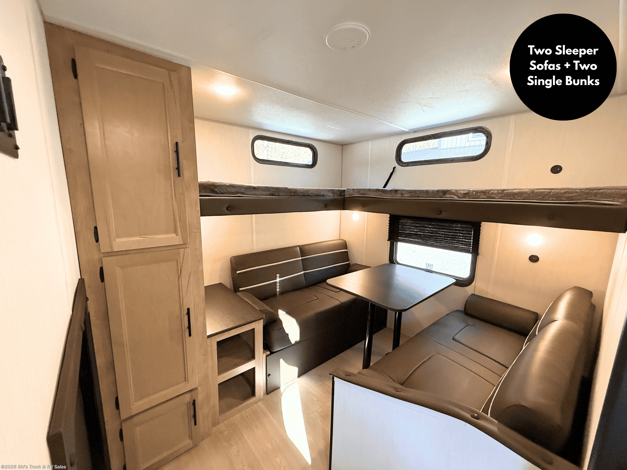 2026 Forest River Cherokee Grey Wolf Black Label 29NMBL Bunkhouse Travel Trailer; 34 Foot; 1 Slide; Sleeps 10; Hitch Weight: 938 Lbs.; Dry Weight: 7561 Lbs.; 30 Amp; Power Tongue and Stabilizer Jacks; 40 Gal. Fresh Water Cap.; 38 Gal. Black Water Cap.; 38 Gal. Gray Water Cap.; Two 20 Lbs. Propane Tanks; 15,000 BTU AC; 20,000 BTU Furnace; 10 C.F. (12V) Refrigerator; On Demand Water Heater; Convection Microwave; Airfryer; 3-Burner Stove; Three TV Jacks; Speakers; One Fireplace; Stainless Steel Sink; Pantry; Solid Surface Countertops; U Shaped Dinette; Jack-knife Sofa; RV King; Single Bunks; One Bathroom with Shower; 15 Foot Power Awning with Patio Light; Backup Camera; Solar Package ; Outside Kitchen with Icemaker and Grill; Outside Shower; Exterior Storage; Foldup Steps; Grab Handle; Roof Ladder Prep.; Fold Down Rack; Magnetic Door Holders; Battery Disconnect; Black Tank Flush; Frameless Tinted Windows; Zebra Shades; Climate Package; Thermo-Foil Insulation; Aluminum Wheels; Spare Tire; One Year Limited Warranty; Financing Available; Nice Travel Trailer with a Neat Floor Plan for the Price: $34,995. Call Skis Truck & RV Sales at 765-344-1111 or visit us at for more information.